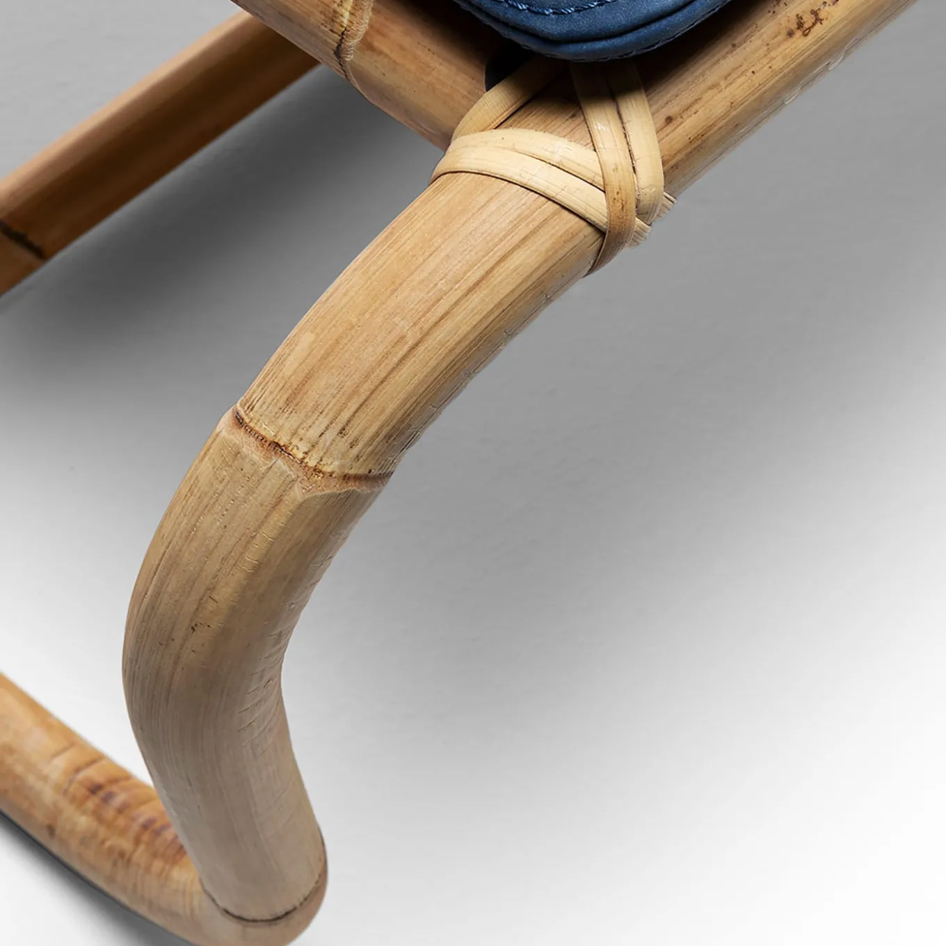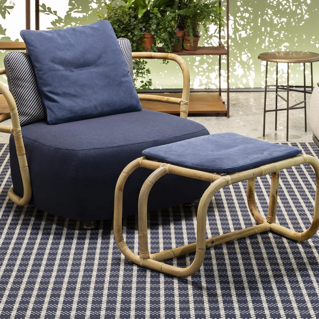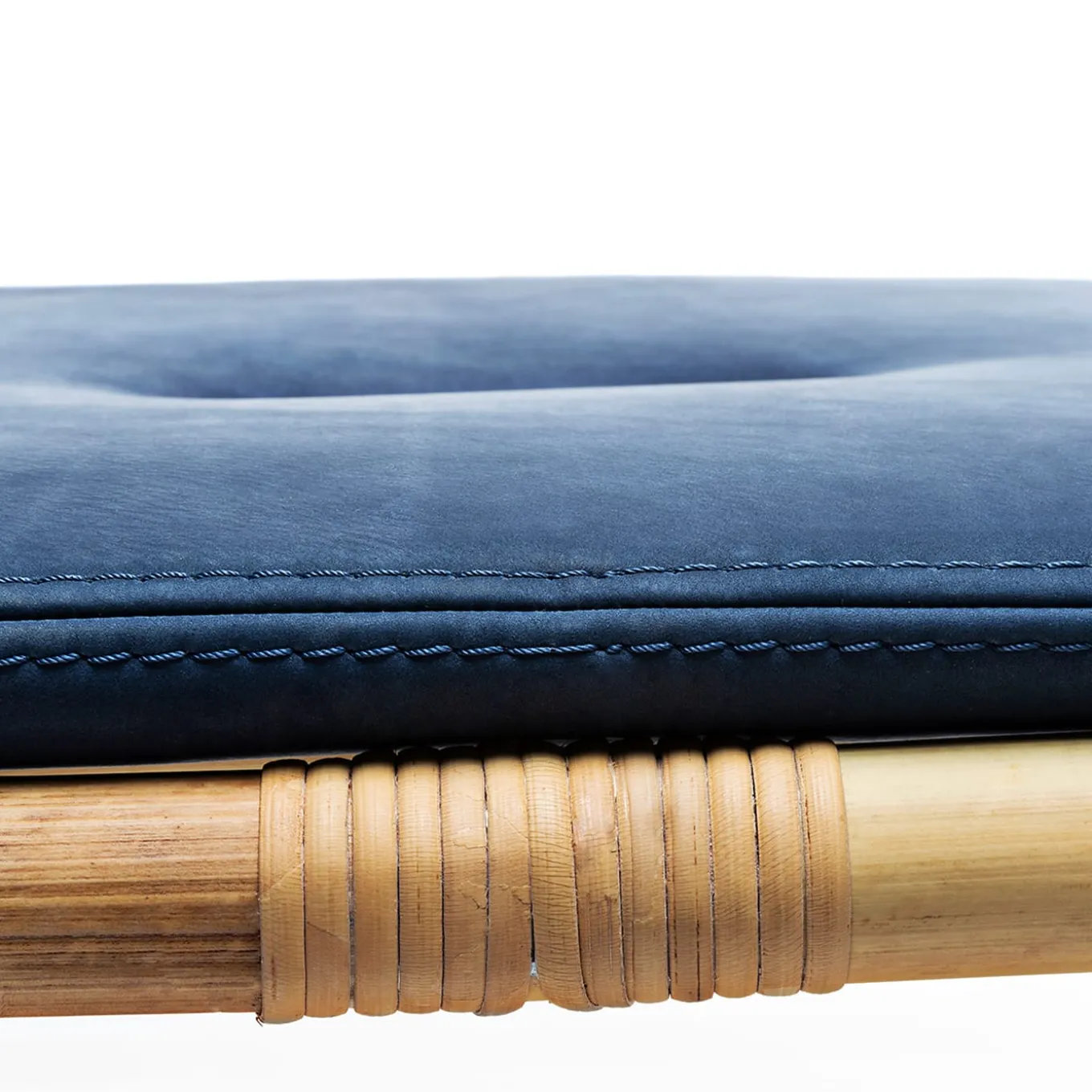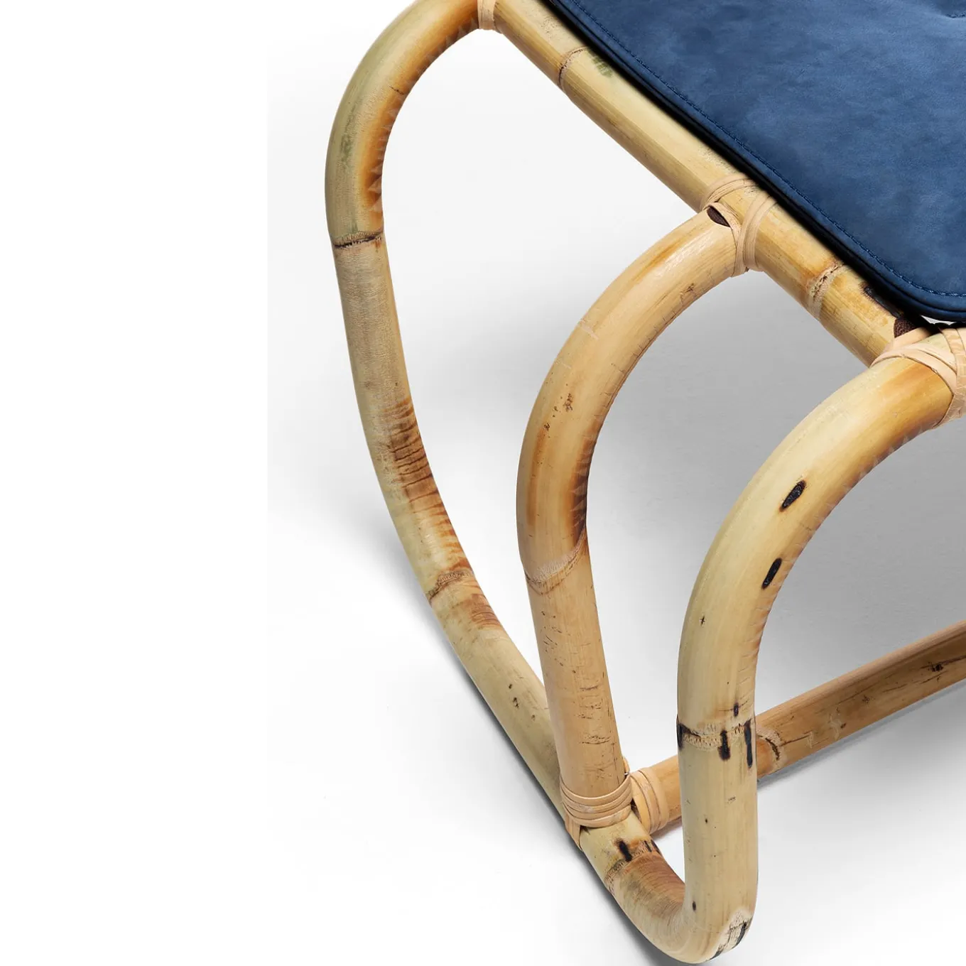 Clean and organic, nature-inspired lines define this splendid design by Massimo Castagna, distinguished by a continuous stretch of natural cane making up the whole structure. Enriched with a Nubuck leather cushion boasting a blue color. An outdoor cover is recommended to protect the piece when left outside, please contact the Concierge for details. Customizable upon request to suit any decor need or taste. If the products are placed completely outside, nightcovers that can be purchased at an extra price are recommended. Please contact the Concierge for further information and options.