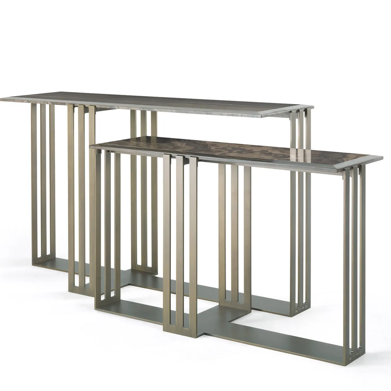 Sculptural lines and refined elegance for the Klee console with top in precious marble and base inspired by the shape of the Etro’s logo. A scenographic element that characterize the space, lending a refined and eclectic charm. Console structure in patinated bronze metal. Top in marble cat. A Eramosa counter-pass cut. Big Console: L 140 D 42 H 85 cm; Small Console L 110 D 37 H 70 cm.