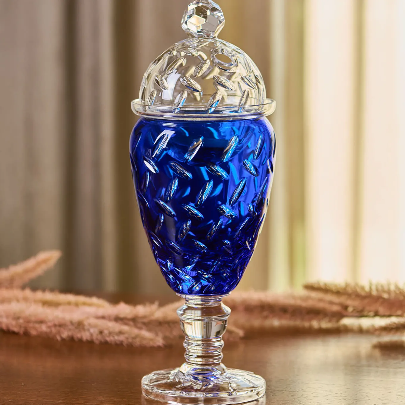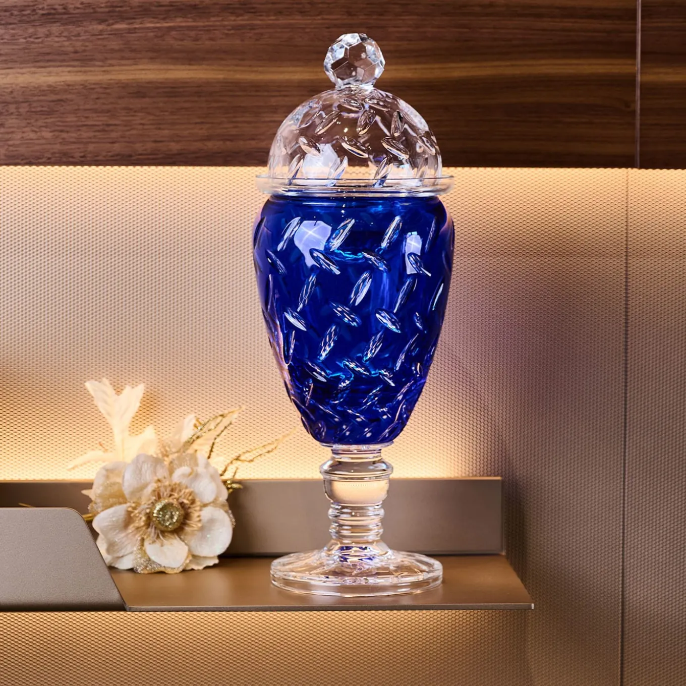 Incense has been enjoyed in the world, for many centuries, in raw and with its natural form, for praying, meditating, or creating pleasant environment atmospheres. The concept of Mario Cioni was to bring this moment into a more aesthetic celebrative and innovative form. On top, a spherical clear crystal, with a bright cut and three separate holes, permits it to divert the smoke and partially hides the charcoal. The crystal knob is necessary to pull up the lid for recharge with more incense.