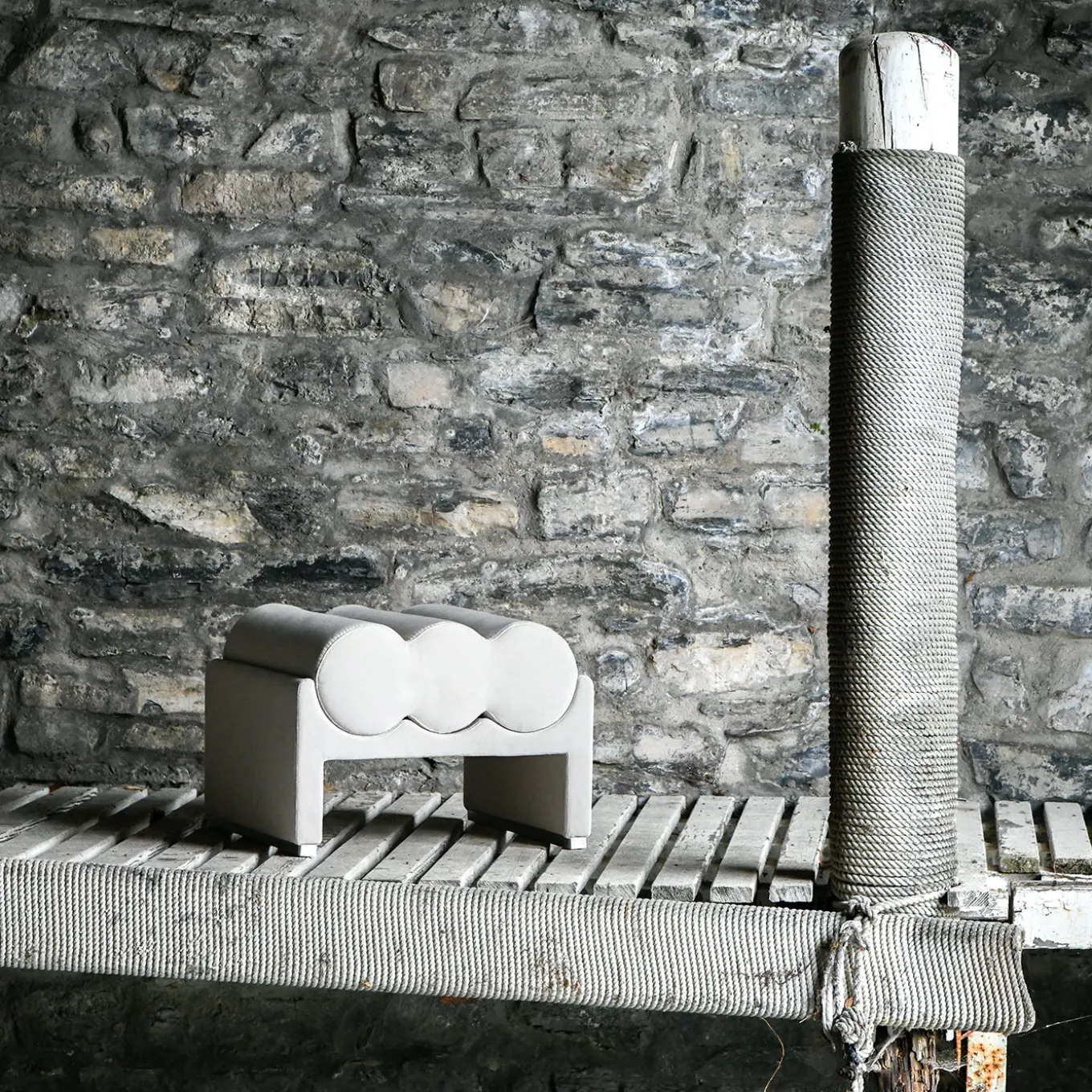 An elegant design of contemporary flair, this pouf features a distinctive shape inspired by the armchair Kylindo, which makes it the perfect complement to the seating design. A sophisticated interplay of geometric lines, it features a waved seat comprised of three cylinders. It is entirely upholstered with a beige fabric and is customizable upon request. Please consult the Concierge for further information.