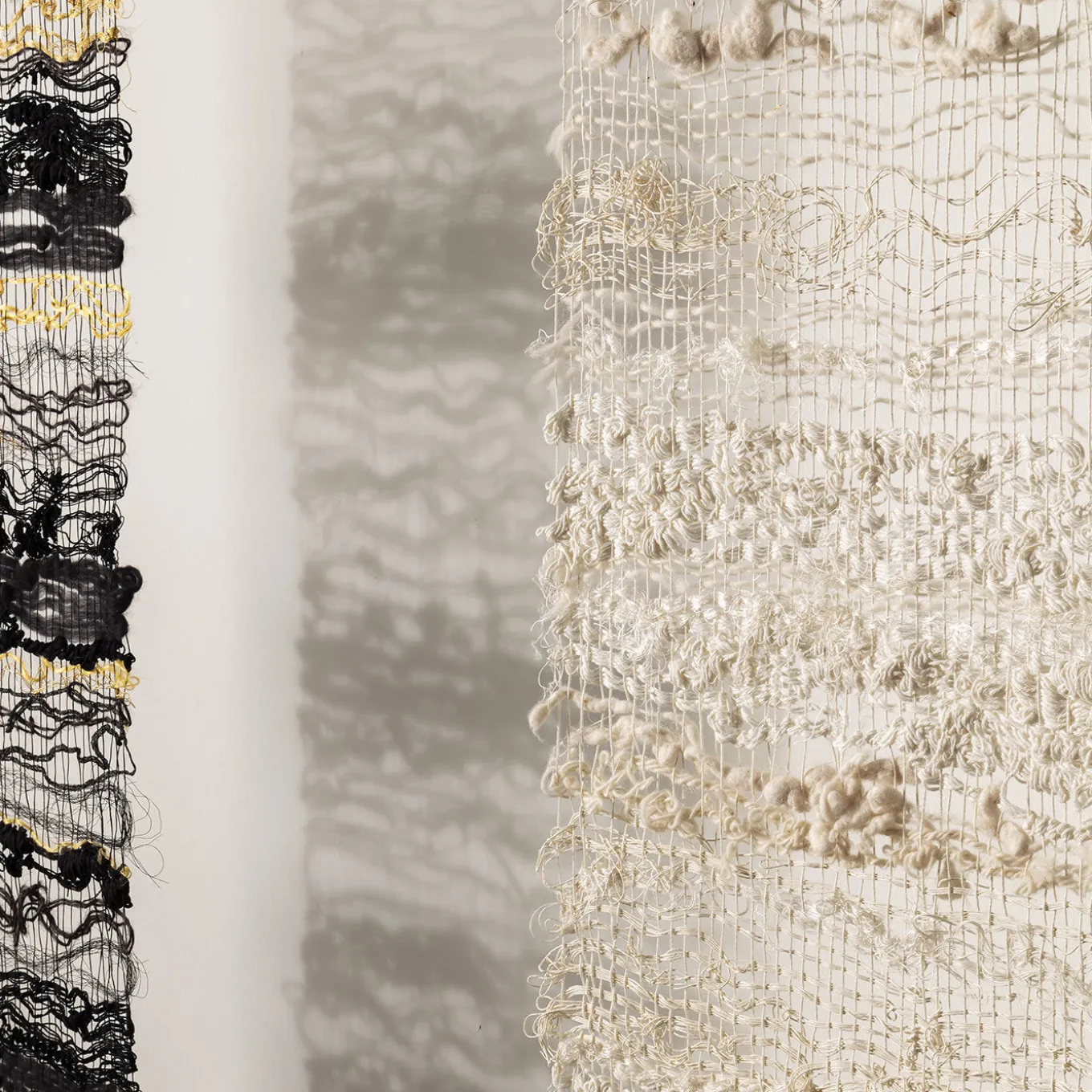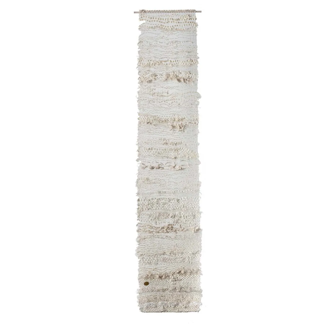 This fascinating hand woven vertical tapestry uses traditional techniques in a composition of linen, hemp, silk, shantung silk, wool and cotton. Seeking to represent a dialogue on The Home, the tapestry is best hung at a distance of 7 – 10 cm from the wall, so as to create delightful and decorative shadow plays. Size and coloring are customizable.