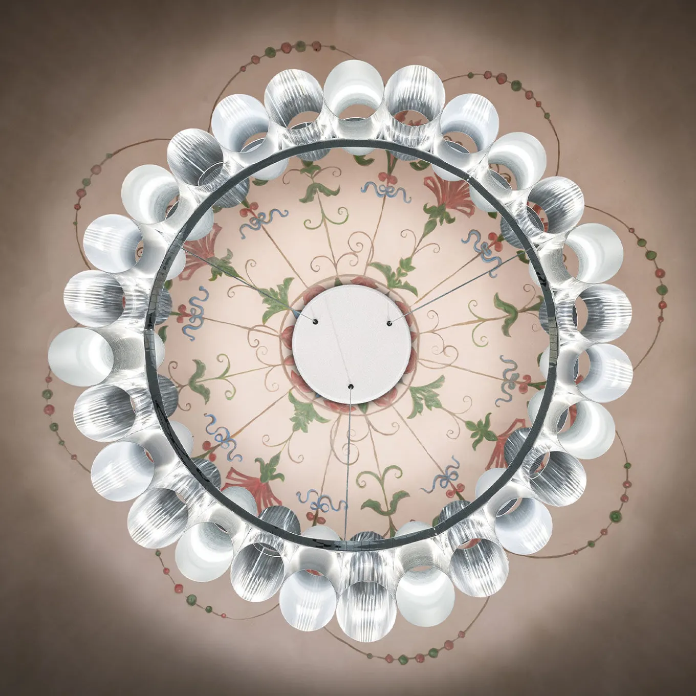 Perfect for adding a glamorous accent in a living or dining room, this pendant lamp features an elaborate body composed of gray and white techno-polymer cylinders alternating at different heights on a single tier. This exclusive design by Lorenza Bozzoli conveys an opulent aesthetic inspired by the 1950s style and a fabulous glow generated by the internal light source reflecting on the shimmering pewter metal rings and the smooth and striped surface of the diffusers.