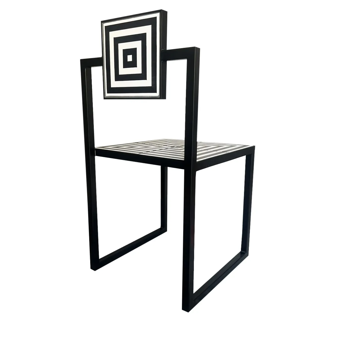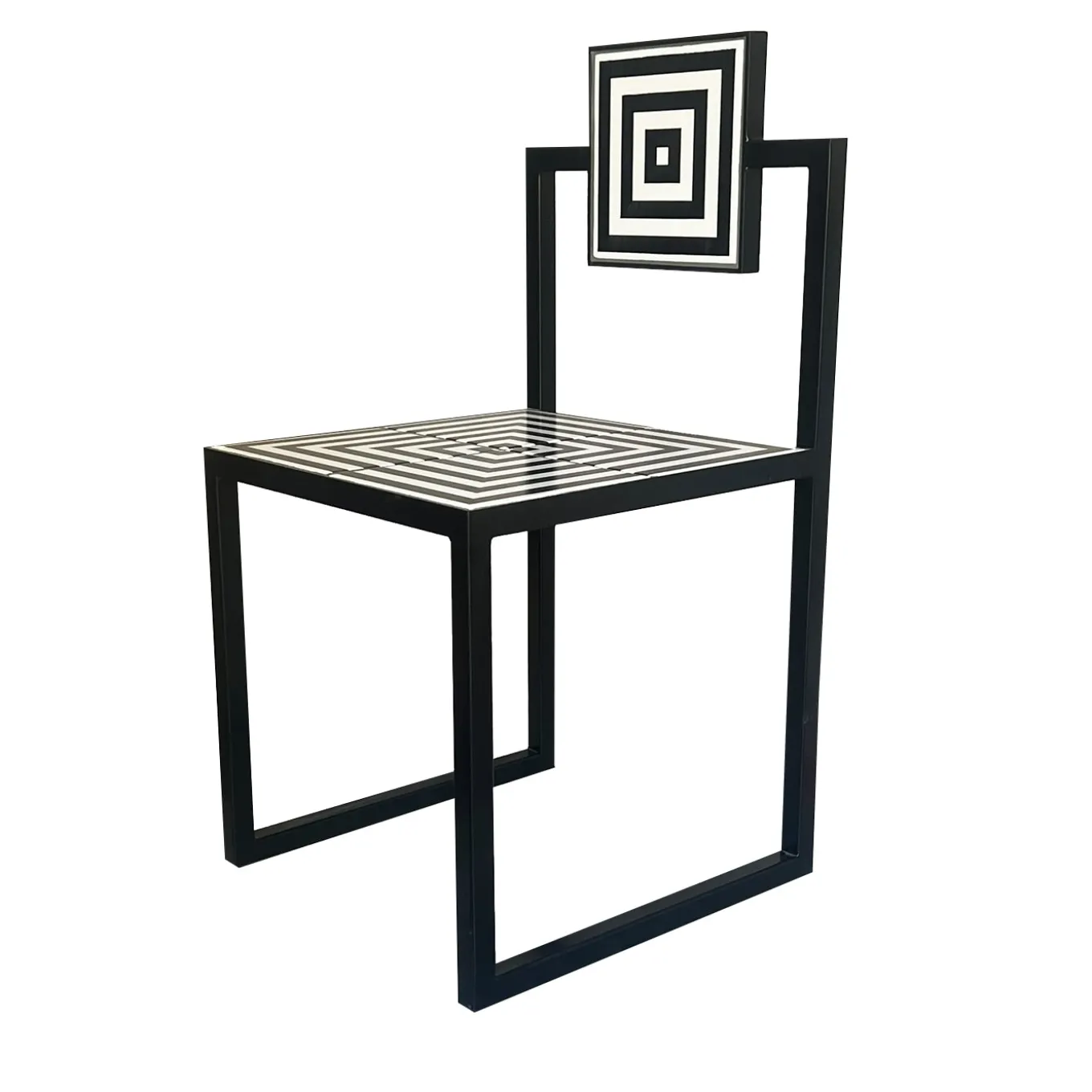Enhance outdoor living spaces with the Labirinto Black & White Outdoor Chair, designed by Francesco Della Femina. This chair seamlessly blends a minimalist and modern aesthetic with the timeless elegance of its classic tile patterns. Crafted from a durable black painted iron structure, it has been treated to withstand outdoor conditions, ensuring longevity and resilience. The seat and backrest feature six striking, hand-painted black and white tiles, each a testament to contemporary artistry, made on the Amalfi Coast. Versatile in design, the chair is available in various structure colors and tile patterns upon request, allowing for personalization to complement any garden or patio decor.