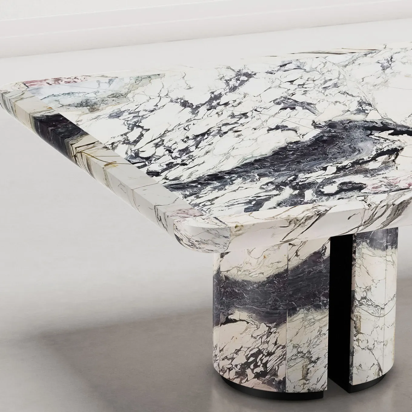 The L’Alberto dining table features a top made of matte Breccia Capraia marble supported by a solid marble frame, anchored to two bases with matte black metal plates. The bases consist of two half-cylinders with a matte Breccia Capraia marble exterior and matte black metal interior and plinth. Available in this exclusive material combination only, the one-off edition includes a custom engraved brass plaque. Its monumental design combines brutality and grace, offering timeless elegance.