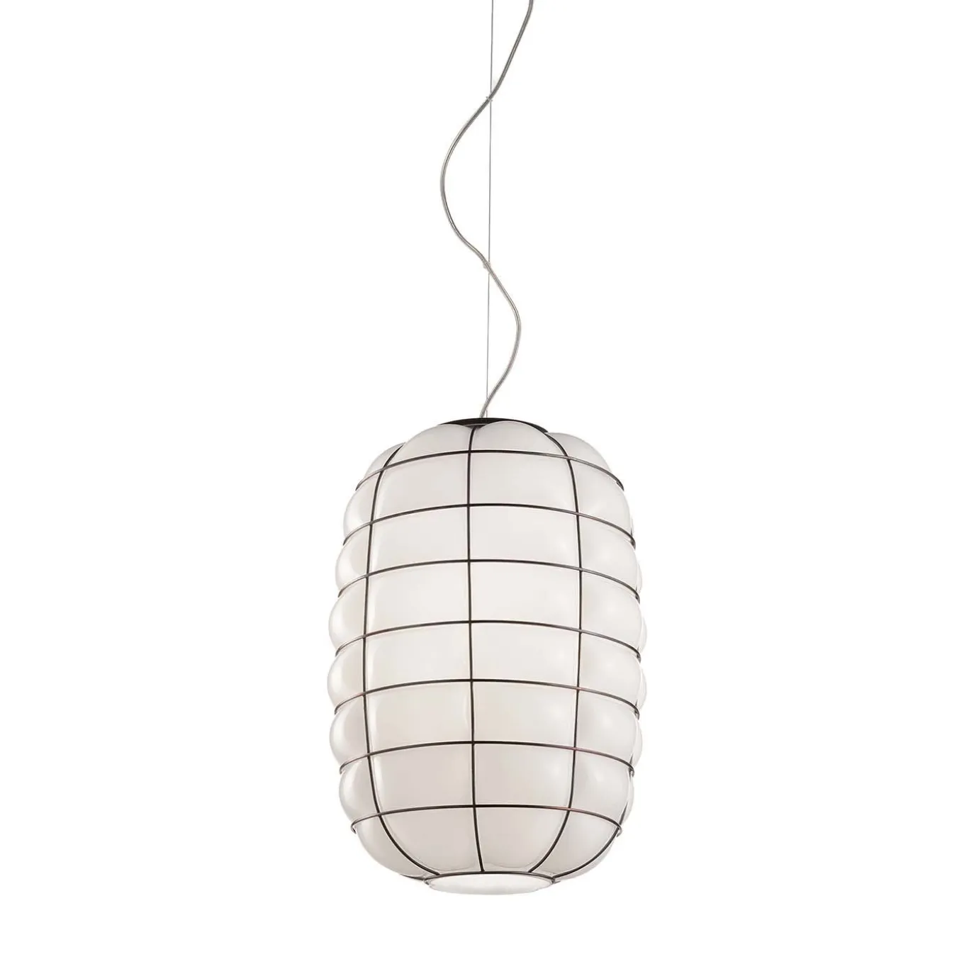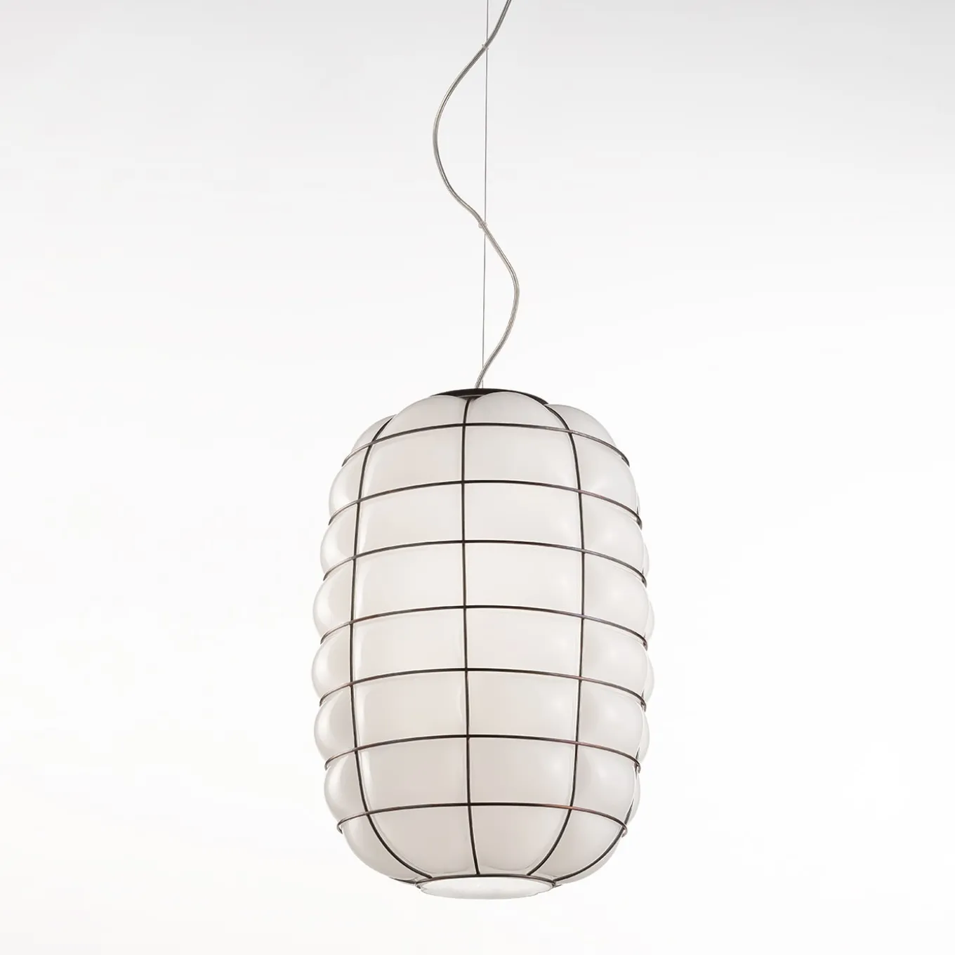 This elegant ceiling lamp is in the shape of a lantern, reminiscent of the centuries-old tradition of these iconic objects crafted in Venice. This modern interpretation features a bronzed steel cage into which white Murano glass is mouth-blown to create a delicate object that seems to be made of air. This sophisticated and minimalist piece will suit any decor, particularly a contemporary one. The lightbulb is E27 150W max, also available UL E26 with 60W max. Due to the artisanal nature of the process, slight variations may occur. The metal�s finish and the glass�s shade can differ from piece to piece, enhancing the uniqueness of each creation.