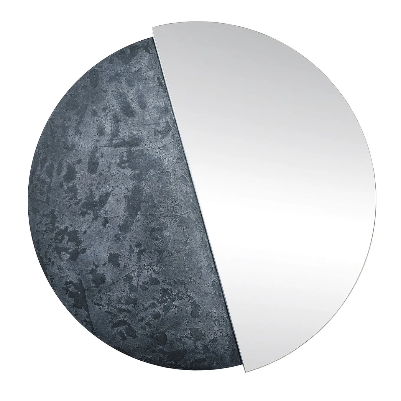 A large round wall mirror featuring a semi-circular reflective surface paired with a semi-circular decorative panel finished with silver troweled resin. Designed for 360-degree rotation, this piece introduces asymmetry and contrast, blending functionality with artistic expression. Each mirror is a unique creation, certified and numbered for authenticity, offering a distinct aesthetic statement for contemporary interiors. Available in various finishes and a smaller 90 cm size option. Please contact the Concierge for more information.