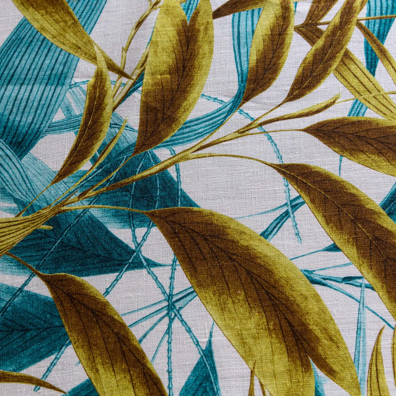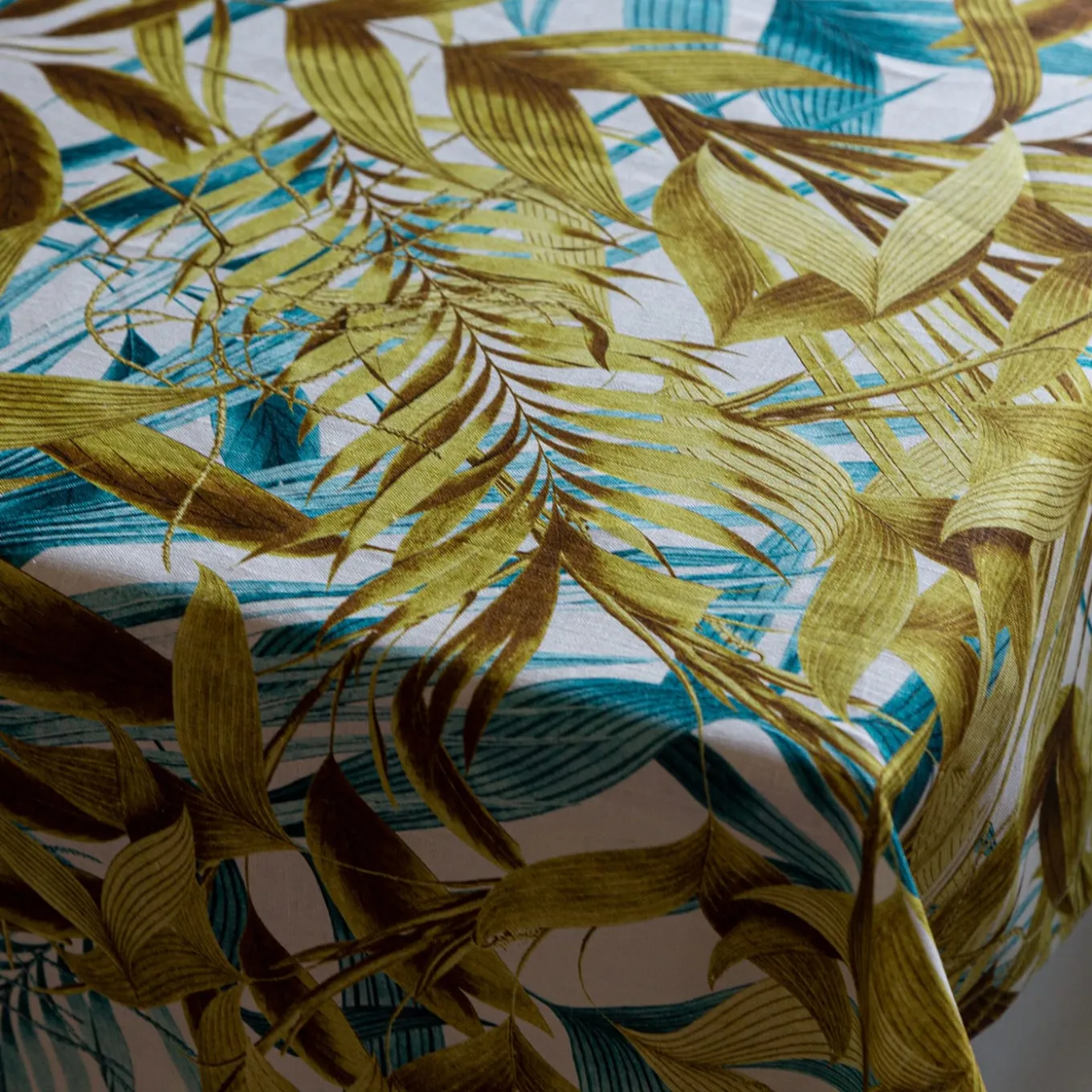 Eclectic and suitable for multiple occasions, this linen tablecloth is composed of a dense interweaving of yellow and turquoise palm leaves, strong contrast, and a unique impact that will give character and joy to your table. Available in different sizes. Please, ask the Concierge for further information.