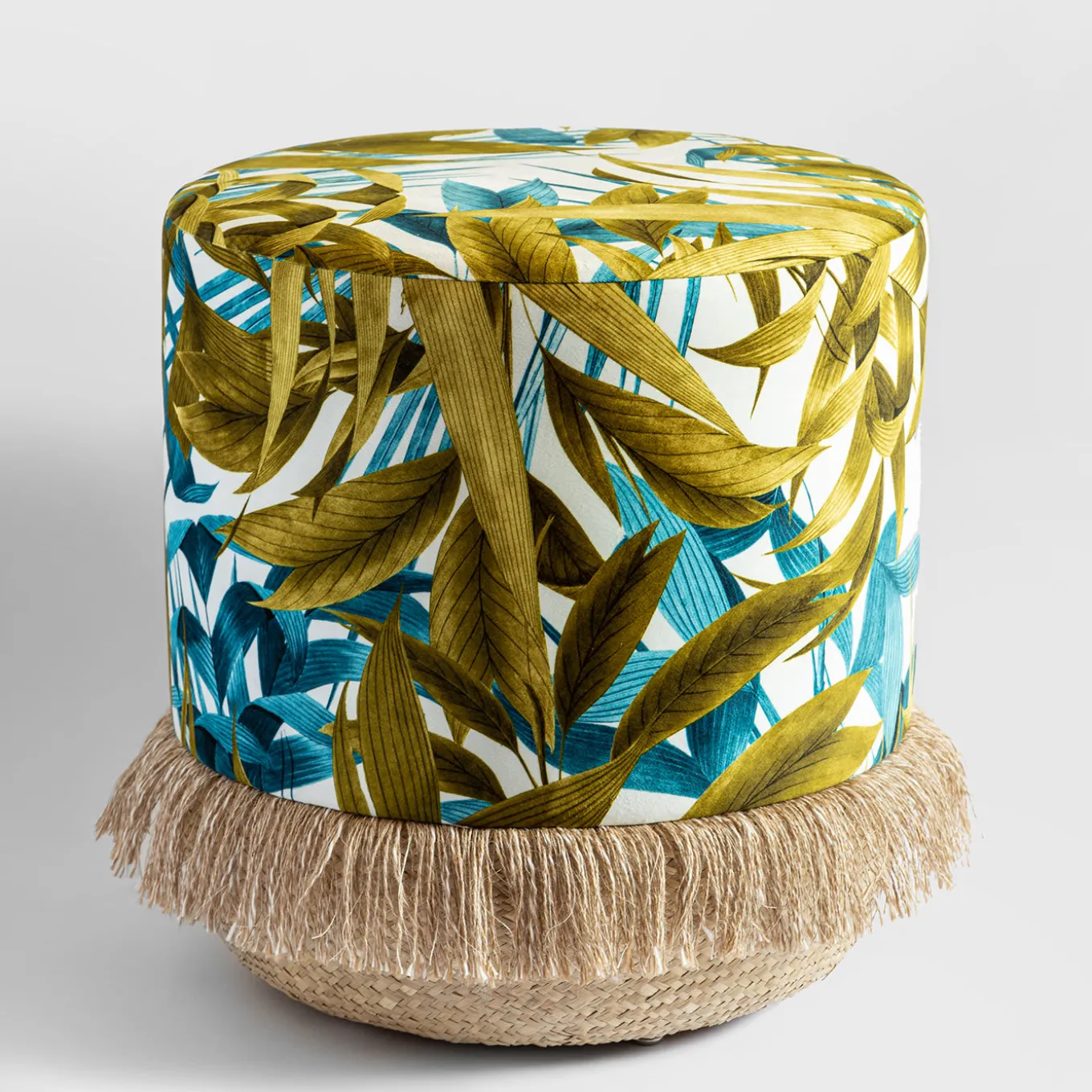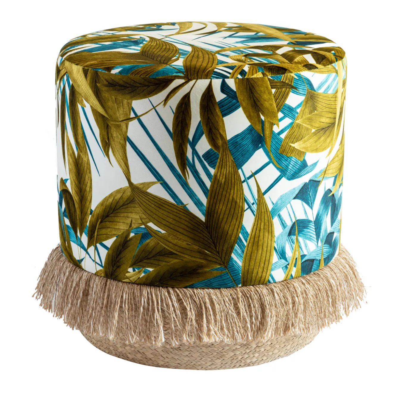 Inspired by designer Vito Nesta’s extensive travels around the world, this elegant pouf evokes images of the rainforest, adding a relaxing touch to any interior with its green tones. Supported by a sturdy beige base crafted of straw and adorned with a playful fringe, its cylindrical body showcases a soft velvet upholstery with a refined pattern of intertwined, overlapping palm leaves in turquoise and golden colors.