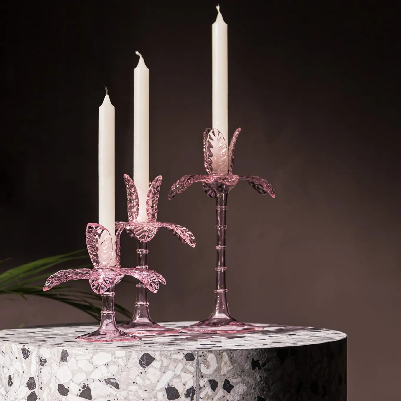 Las Palmas Candleholders Collection is an excellence of Italian Made in Italy. They are produced in blown glass by artisans from Veneto, this makes each piece unique and unrepeatable. Their transparency lends elegance and style to any room in which they are placed, and the three different sizes allow you to create a small exotic garden in your home. Available in seven different colors to give you the opportunity to play with heights and chromatics. Please, ask the Concierge for more information.