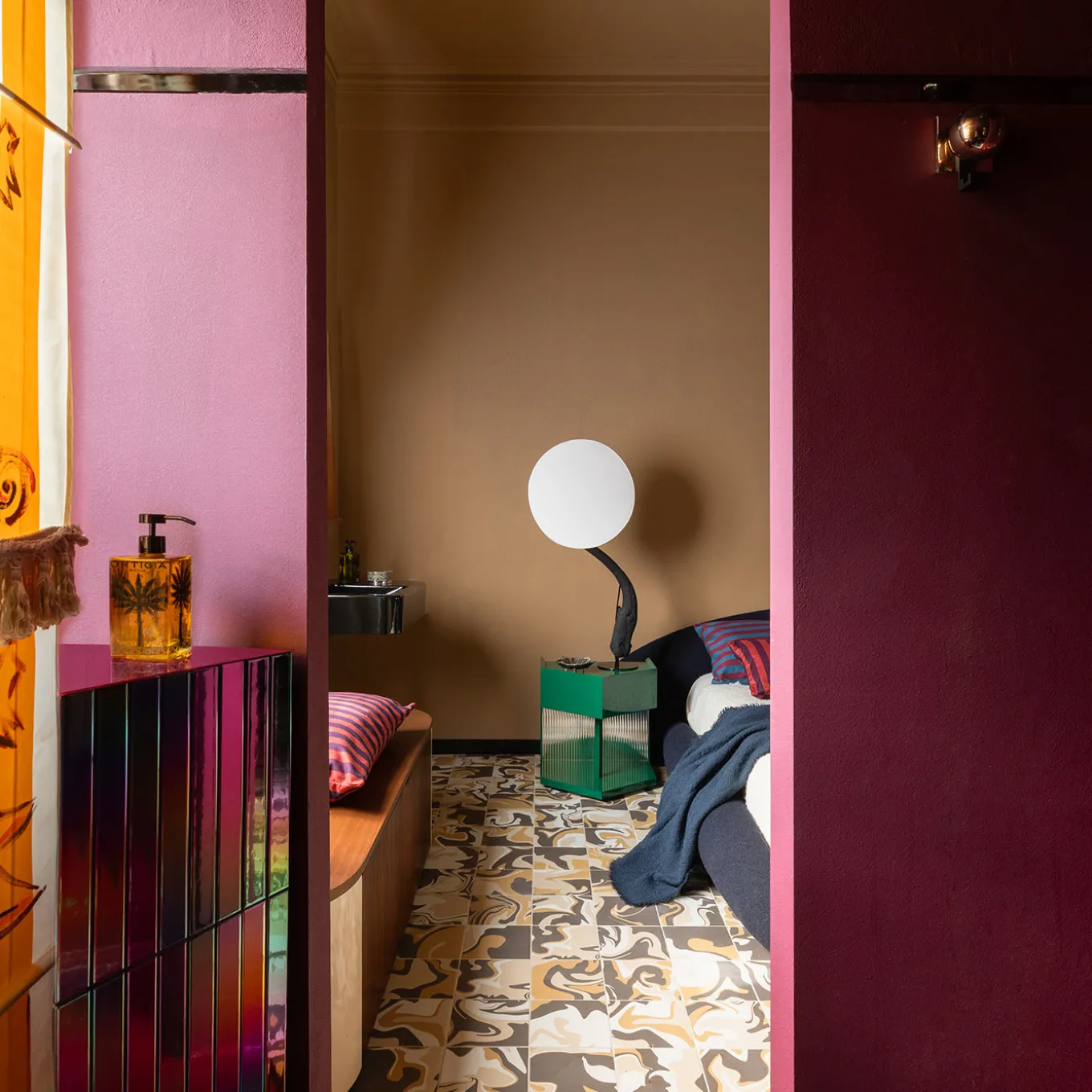 Last Call green gloss hexagonal nightstand from the Motel collection features a distinctive hexagonal shape with a high-gloss lacquer finish. The fluted mirror detail adds a refined touch, enhancing its modern appeal. Designed with a discreet drawer to offer practical storage, this versatile piece suits both residential and contract interiors, combining sleek aesthetics with functional design.