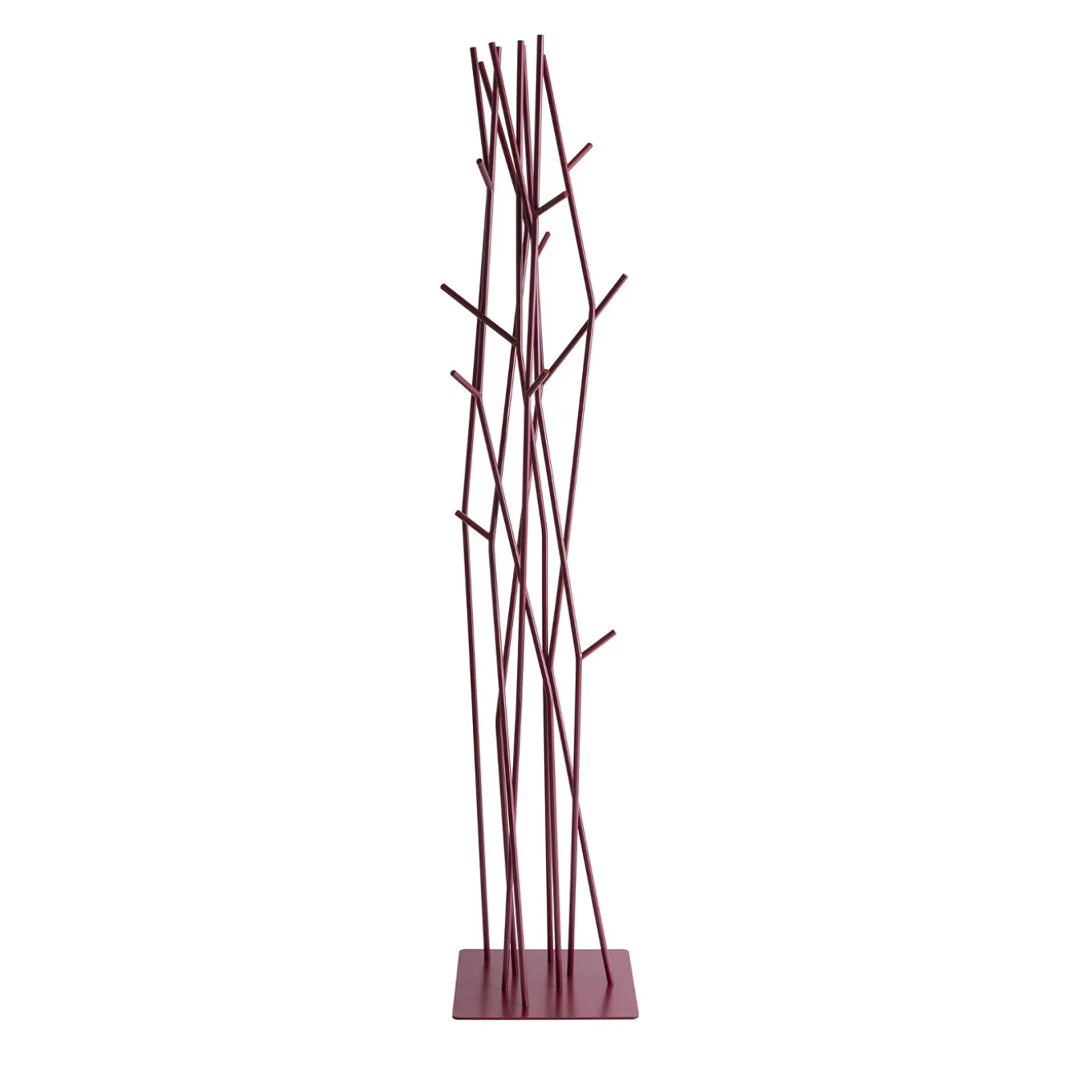 The Latva coat rack features a striking design inspired by natural branches, constructed from painted steel with multiple thin rods extending upwards to provide ample hanging space. Its slim, vertical form occupies minimal floor area, supported by a flat square base for stability. With a vibrant purple red shown, this coat rack adds a modern and artistic touch to entryways or living spaces while maintaining practical functionality. Other color options available. Please contact the Concierge for further information. Design by Mikko Laakkonen.