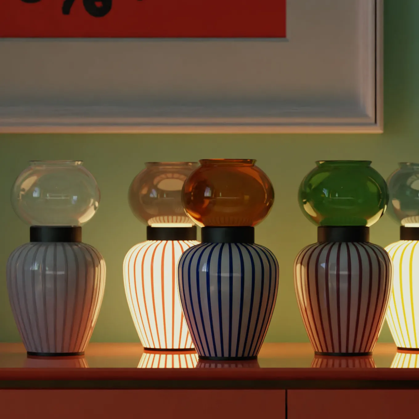 A romantic, vintage-inspired palette of pink and green characterizes this marvelous glass table lamp, designed by Serena Confalonieri and inspired by ancient oil night lamps. Named after the Arabic word for “night”, it is best showcased on a wooden bedside table, it will imbue a contemporary interior with cozy warmth and an intimate feeling of comfort.