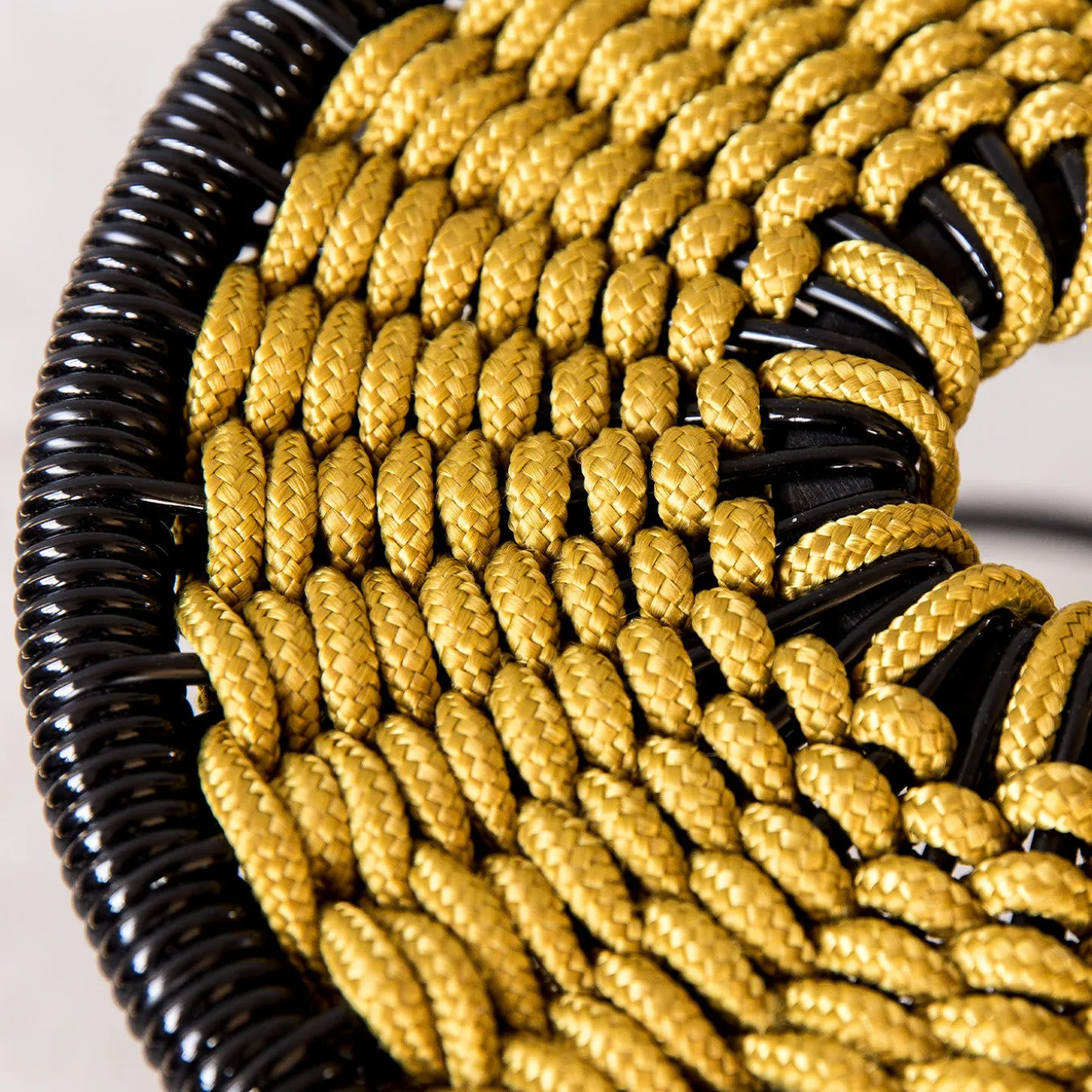Redefining traditional straw weaving techniques and experimenting with innovative materials, Impagliando Design creates unique designs of incomparable craftsmanship. Part of the Le Rossette Collection of stools and potholders, this stool has a black-powder-coated iron structure with four slanted legs and a ring-foot holder. The splendid woven top is twisted by hand directly onto the frame in glossy black PVC warp and brass polypropylene technical rope. Available in three sizes and suitable for both indoors and outdoors, contact the Concierge for customization options.