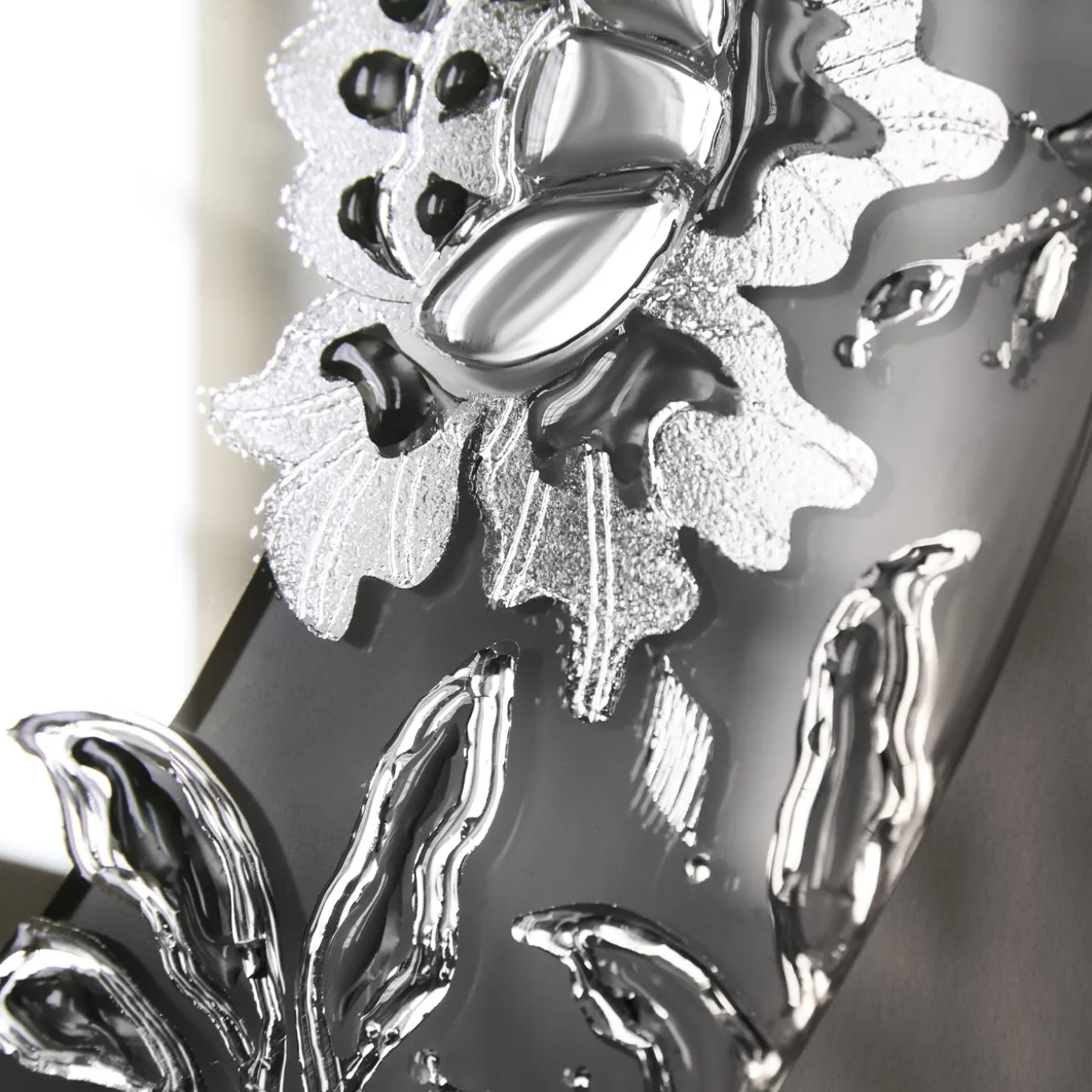 Léa round silver wall mirror features an elegant, intimate design ideal for small spaces or decorative vignettes. This piece is entirely handmade, with unique variations and subtle imperfections that enhance its artisanal character. The mirror’s delicate floral detailing on the border adds a refined touch, combining classic charm with a contemporary aesthetic suited for sophisticated home décor.