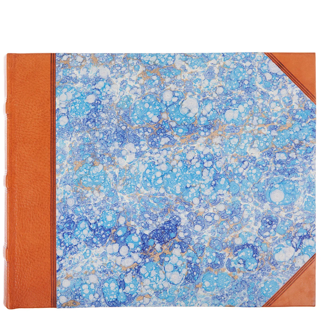 Large photo album by Florentine bookbinder Giannini with naturally tanned leather spine and corners, and a gorgeous blue marbled paper cover. It contains 50 ivory card sheets and is entirely handmade with ancient bookbinding techniques to achieve impeccable aesthetic and functionality.
