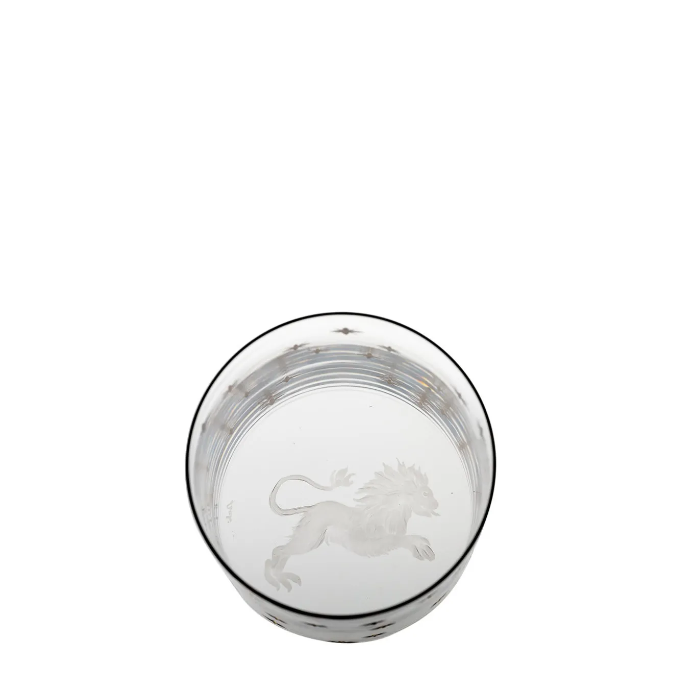 This exquisite glass in mouth-blown crystal is ideal for adding an elegant accent to everyday meals. Its cylindrical shape and versatile size make it perfect for water or soft drinks. Small stars cut and decorated in pure gold add a precious element to this piece that is customizable at the bottom, with an etched image that depicts the symbol of a zodiac sign. Modern and sophisticated, this object can be paired with the Crystal Chalice and the Cylindrical Crystal Glass for a complete look.