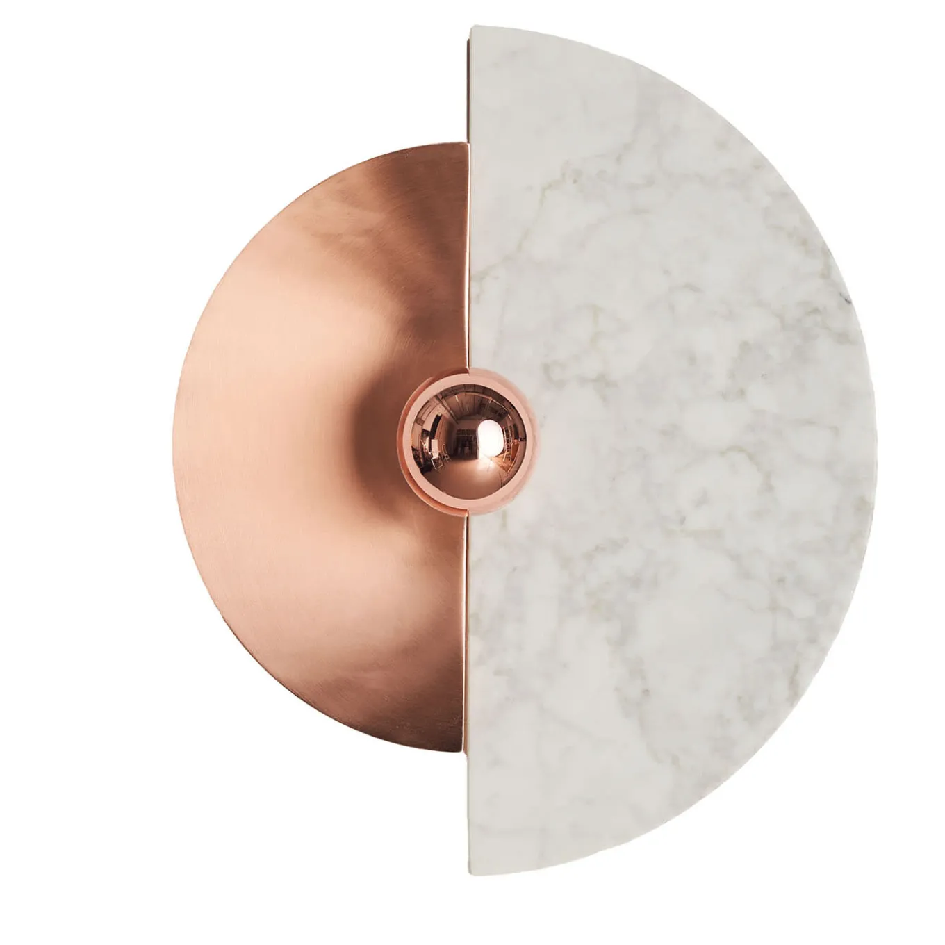 The Levante wall sconce with its circular shape is a strong reference to the sun. The possibility of placing the discs in 12 different positions offers original plays of light and shadow projected on the wall. The brass structure and disc, combined with the other marble disc, are illuminated by a light bulb with a golden cap, which emphasizes the tones of the materials and, at the same time, illuminates the wall with warm colors.