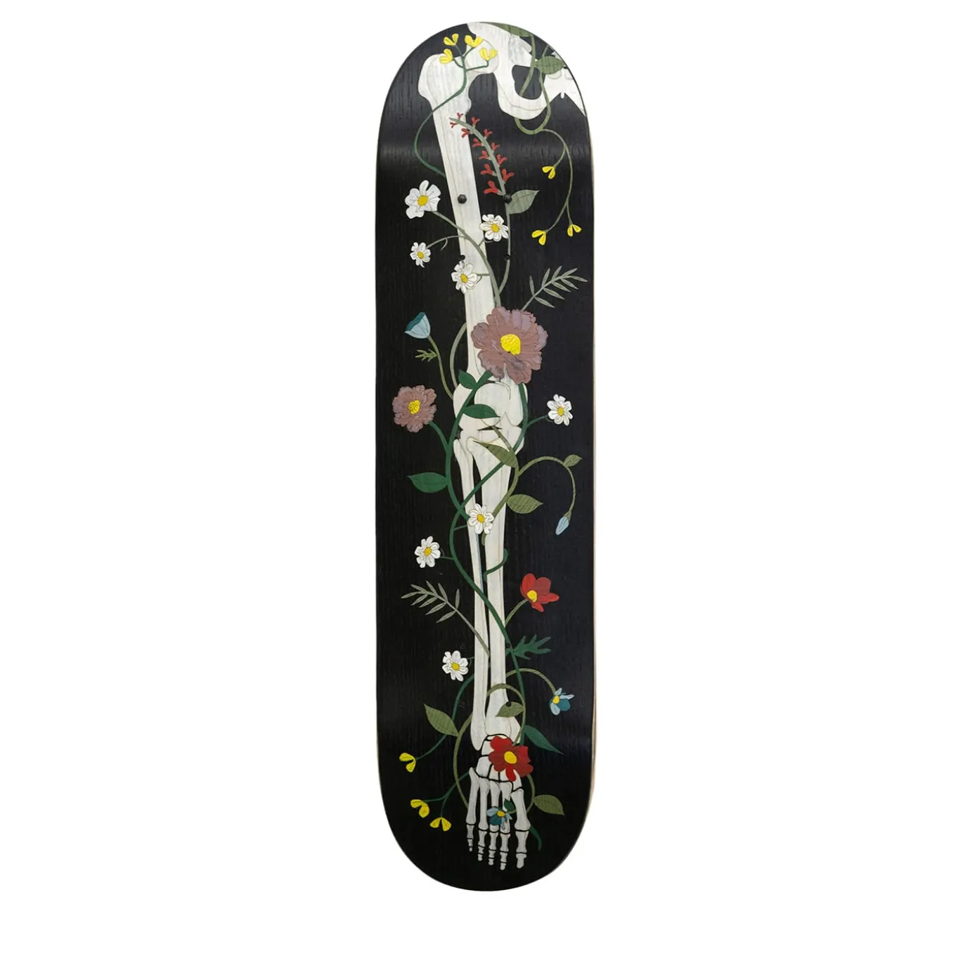 An intricate, polychrome floral motif intertwining with the deft inlay of a human skeleton’s part defines the poetic allure of this decorative skateboard, the perfect piece for adding a fresh and eclectic twist to modern homes. The design evokes the hope for a positive concept of an afterlife, where darkness is interpreted as rebirth and new life in the vibrant flowers weaving between the skeleton. Also available in a variant with a backdrop stained in light blue upon request.