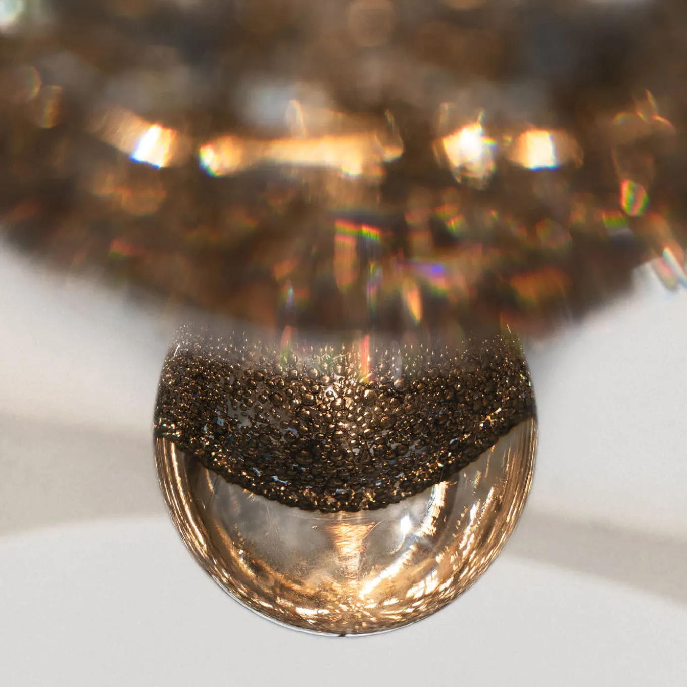 The Life is a Long Song pendant lamp is crafted with Venetian artistry, featuring a teardrop-shaped shade created through a layering process. Handblown glass is immersed in fine brass dust, then encased in another layer of glass, forming delicate air bubbles infused with a golden hue. Each piece showcases the artisan’s skill. Suspended by cords and connected to round brass canopies, these lamps can be installed solo or in clusters for dramatic effect. Bulb are included.