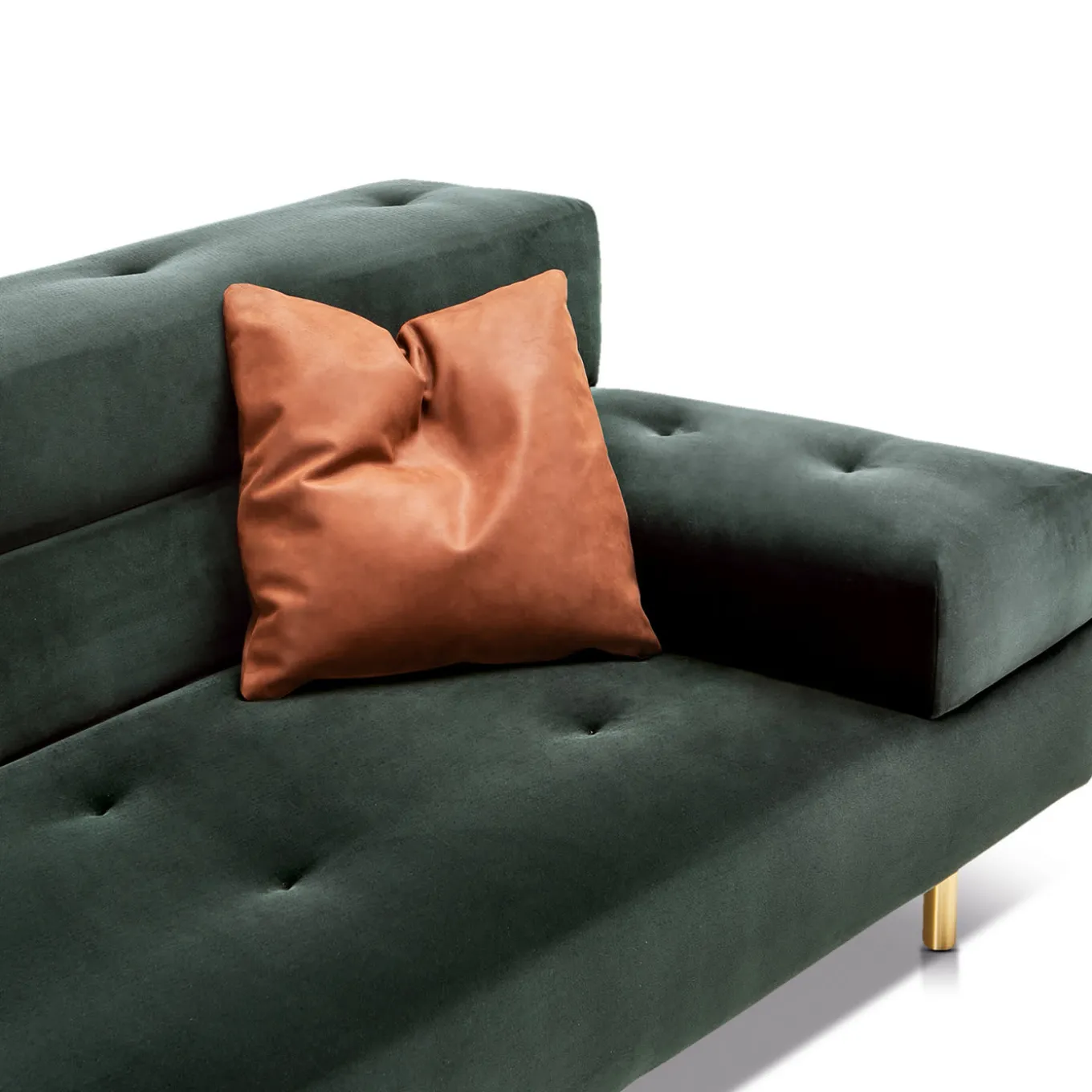 Sleek and sophisticated, this sofa is a versatile piece that will superbly fit both classic and modern decors. Upholstered with refined, green velvet fabric, its long silhouette rests on four slim feet made of satin brass, and on a steel structure padded with multiple layers: multi-density rubber, memory foam, and goose feathers. The seat is reinforced with elastic belts of 6 cm.