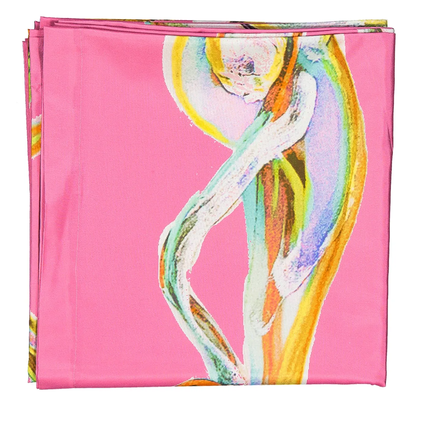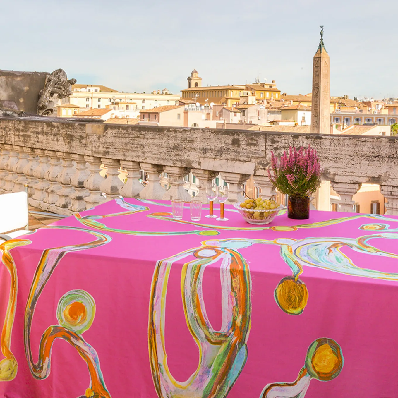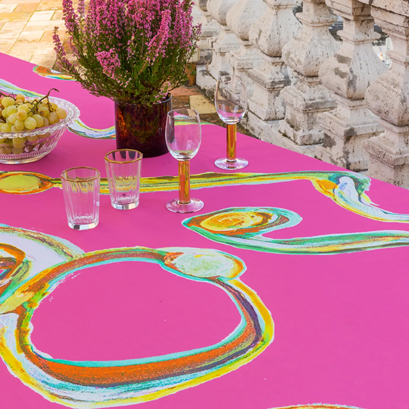 An extraordinary pink color characterizes this gorgeous tablecloth, exquisitely reproducing an original acrylic painting of an abstract, colorful motif. Originally painted on silk and digitally printed onto polyester taffeta fabric, it will make a lively and catchy addition to any style decor. Available also in size: 220×280. Please ask the concierge for details and prices.