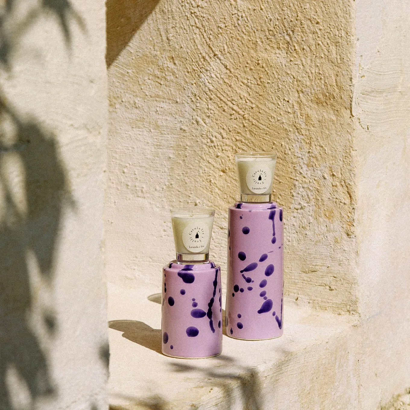 Pair of decorative ceramic candle holders with set of four 50g scented soy wax candles Fragrance Lavanda e Iris (Lavender and Iris). This refined candle holders set is entirely hand made by skilled italian artisans with respect for history, nature and people, reinterpreting the traditional Apulian macchiato technique, the brand’s emblem, as a celebration of the joyful spontaneity of mediterranean nature and its scents.