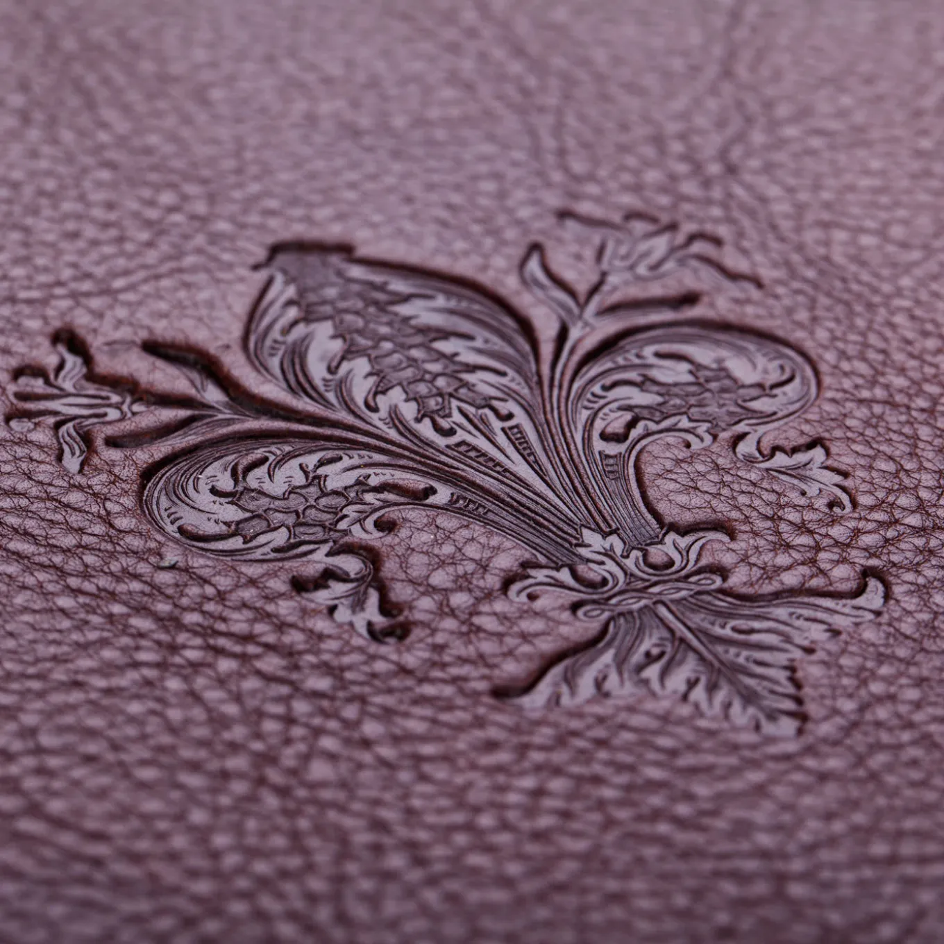 Elegant notebook in soft brown leather treated with the technique of vegetable tanning. It contains ivory pages hand decorated with marbling by 6th generation bookbinding artisans Giulio Giannini e figlio. The cover is embossed with a gold lily of Florence.The book can be customized with a variety of monograms and engravings, as shown in the pictures. Please select the “Please contact me to discuss available options” button during the checkout process, in the “Shipping” section, and our concierge team will contact you immediately to customize your book.