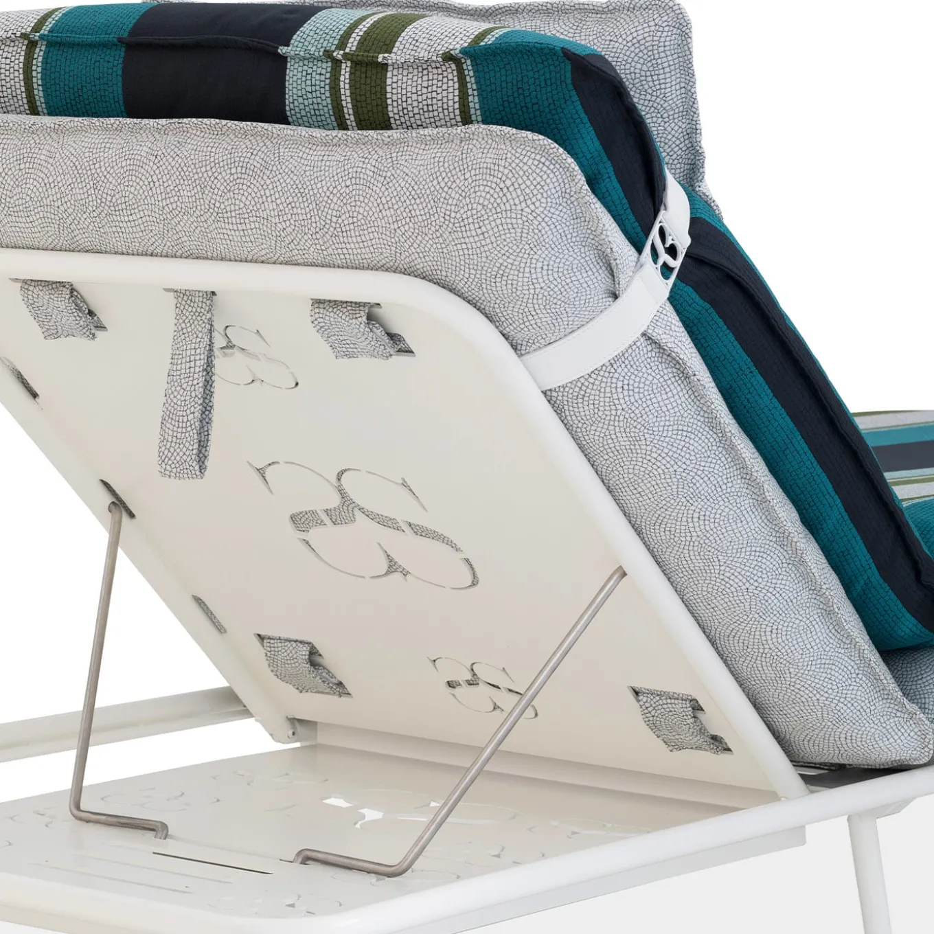 Exceptional comfort and a clean and elegant aesthetic describe this exquisite sunbed, an ideal accent piece to furnish an outdoor area of contemporary style. Made of matte-white aluminum, it features a reclining backrest that changes up to six positions. Cushions are padded with multi-density polyurethane foam, recyclable polyester fiber, and waterproof cotton, all upholstered with a removable, waterproof, and washable Lubuck Ocean and Lubuck Ivory fabric. Enriched with a leather belt.