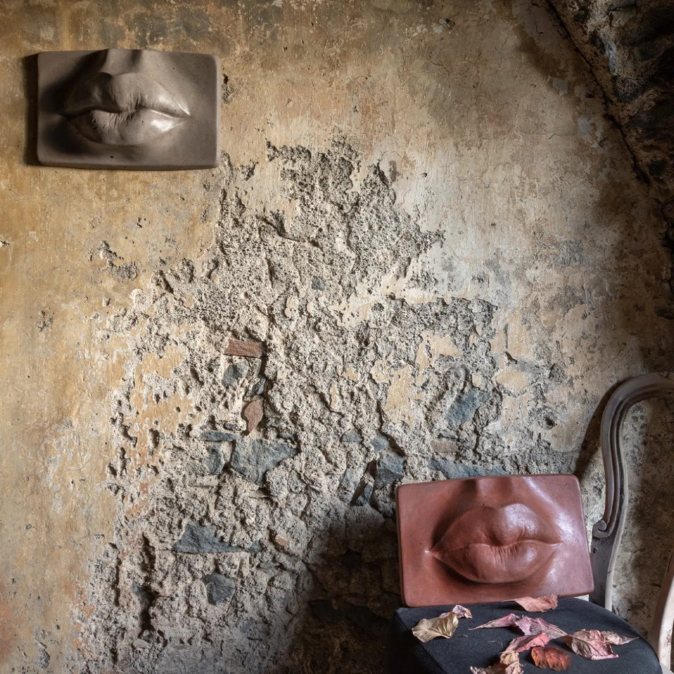 Entirely handmade sculpture with a mixture of cements and red volcanic sands from Etna. The deliberately-made porous texture and uneven colour is the result of a pigmentation obtained thanks to natural materials and slow drying in the air. The final process of waxing creates a slightly glossy protective patina, which can be removed. Equipped with a recess on the back, it can be hung on the walls thanks to the metal brackets supplied with the product.