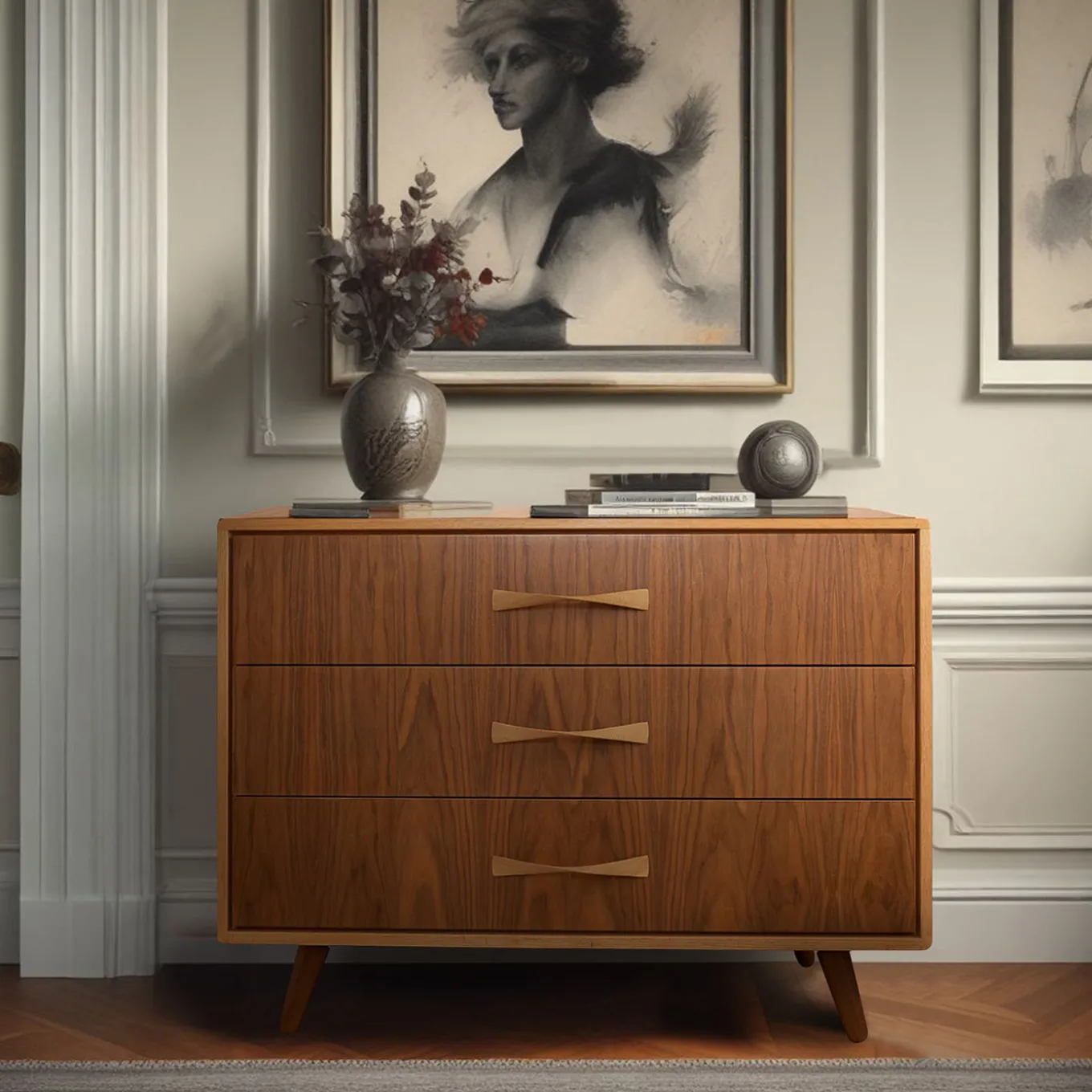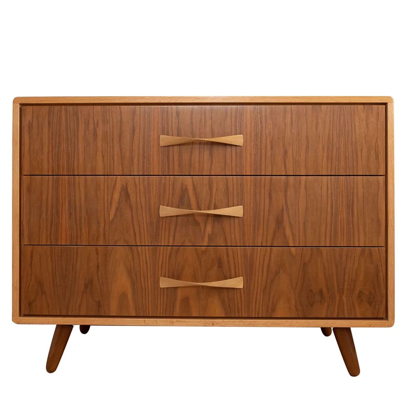 A clean and elegant design inspired by Nordic design, this dresser features a sleek shape handcrafted of solid durmast wood. Its linear and smooth design is enriched with three drawers in Canaletto walnut wood marked by exquisitely twisted handles, lending it a dynamic and lively allure. The drawers’ blumotion opening system by Blum and the short slanted legs fashioned of walnut and metal details complete the piece. Finished by hand with natural, water-based lacquers and beeswax.