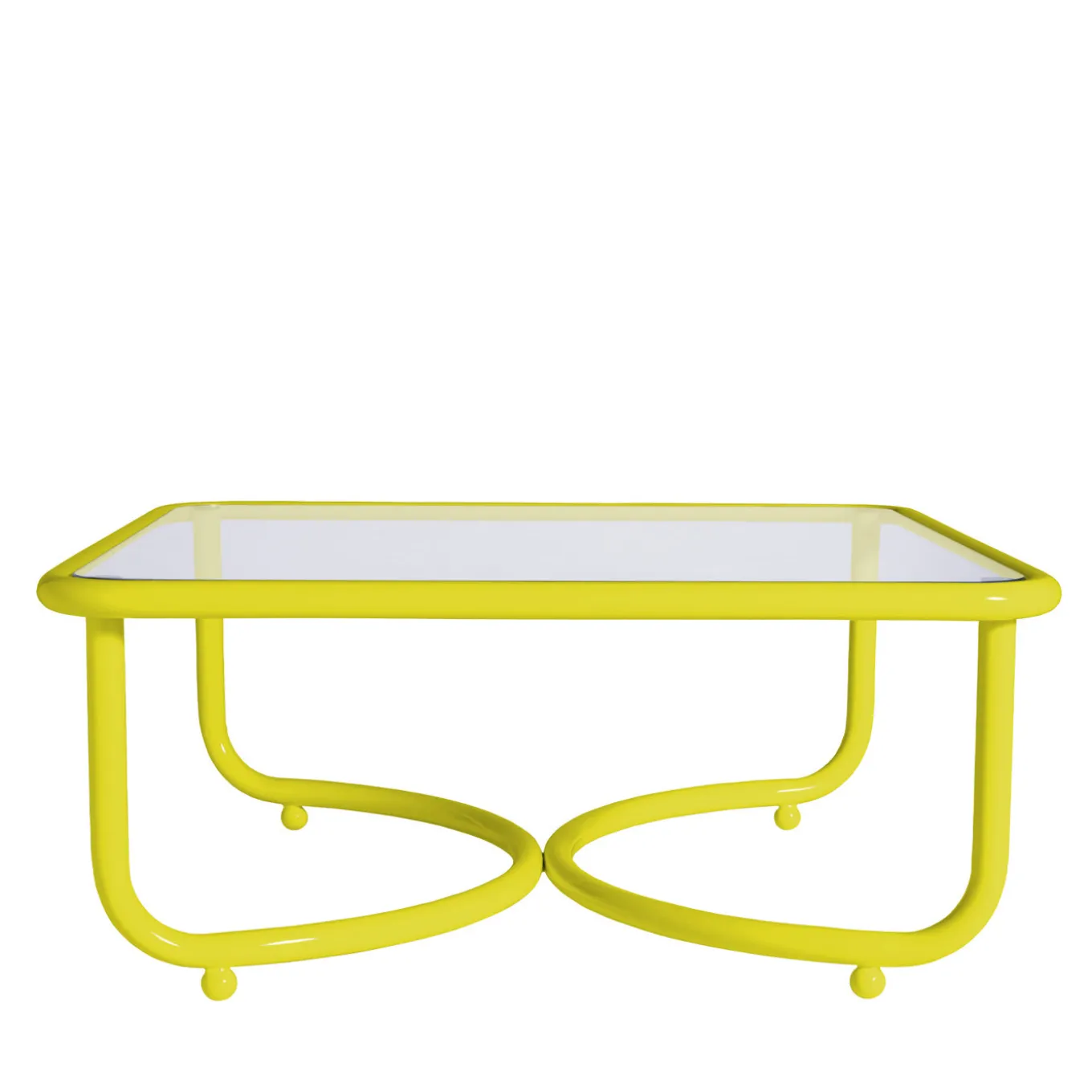 This singular and colorful low table from Gae Aulenti’s 1960s Locus Solus Collection is a tribute to Pop Art and will serve as a vivacious addition for outdoor furnishings. Featuring a bright-yellow-finished cylindrical steel frame of free-flowing lines and curves that are playfully revealed through the extra-light tempered glass top: This piece will make a statement in any garden, patio, or pool side space. If the products are placed completely outside, nightcovers that can be purchased at an extra price are recommended. Please contact the Concierge for further information and options.