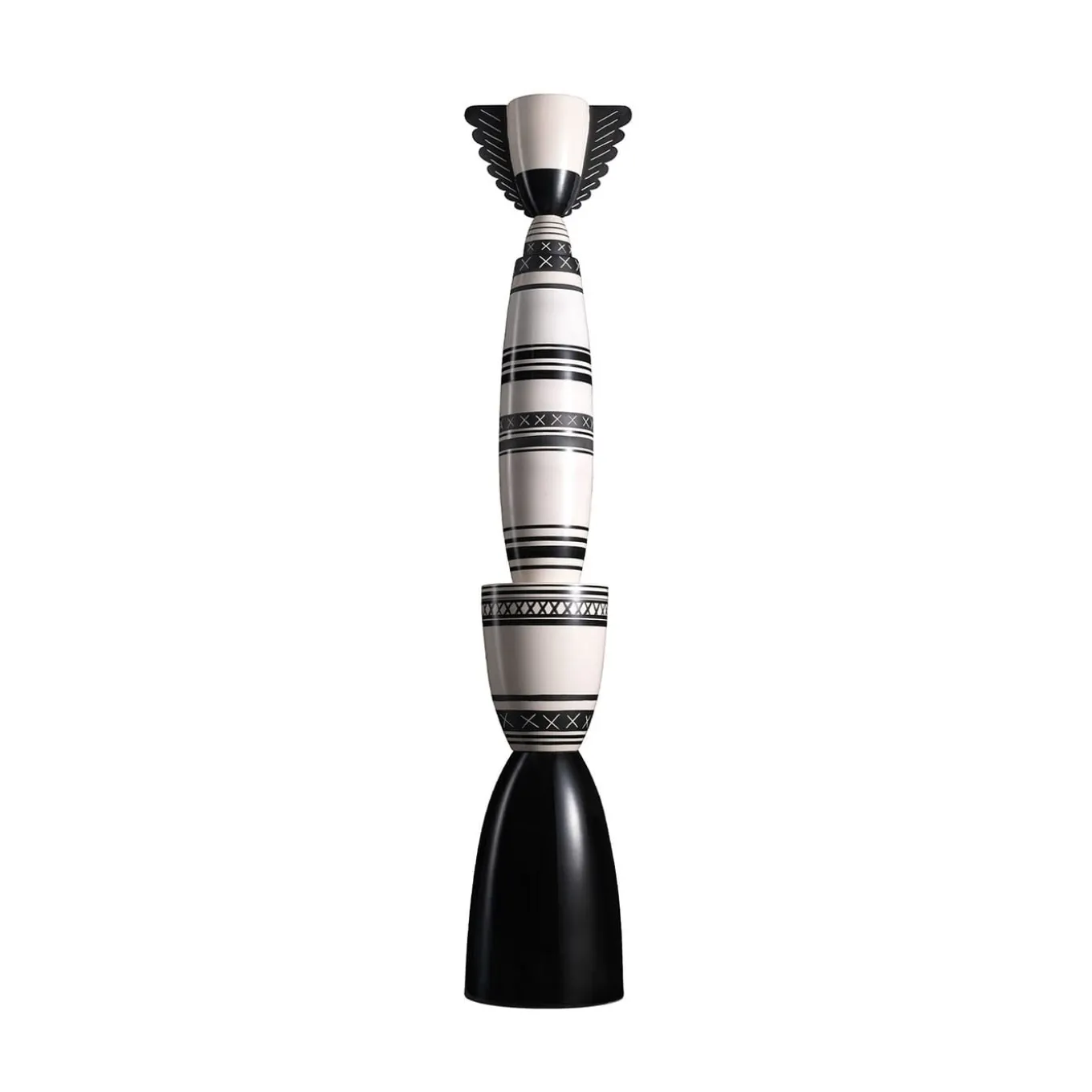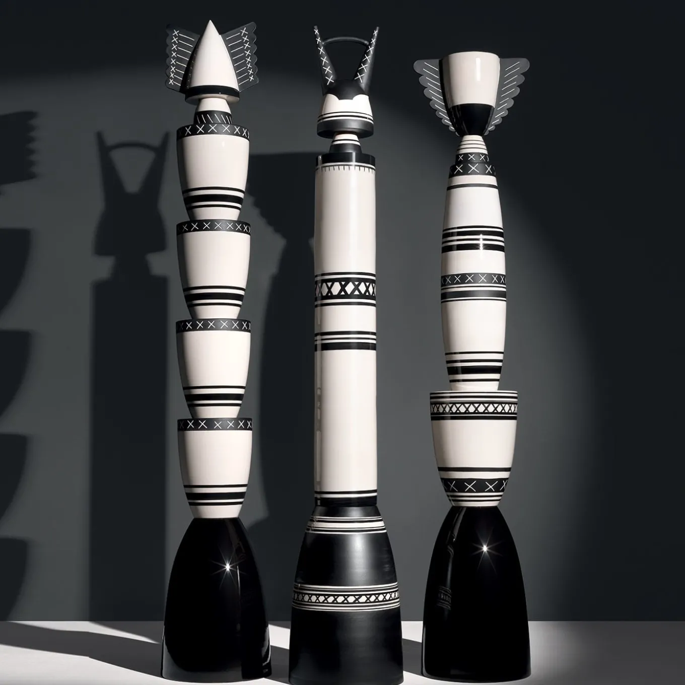 Speed in black and white. A tribal rhythm unfolds, guided by magical geometries and architectures where energies and souls converge. Conical and spherical vases intertwine with lines and crosses in a striking black-and-white ritual. This totem, composed of four handmade clay pieces, features a matte black glaze, white slip painted with black accents, and a transparent crystalline finish. Limited edition of 9 pieces, designed by Ugo La Pietra.