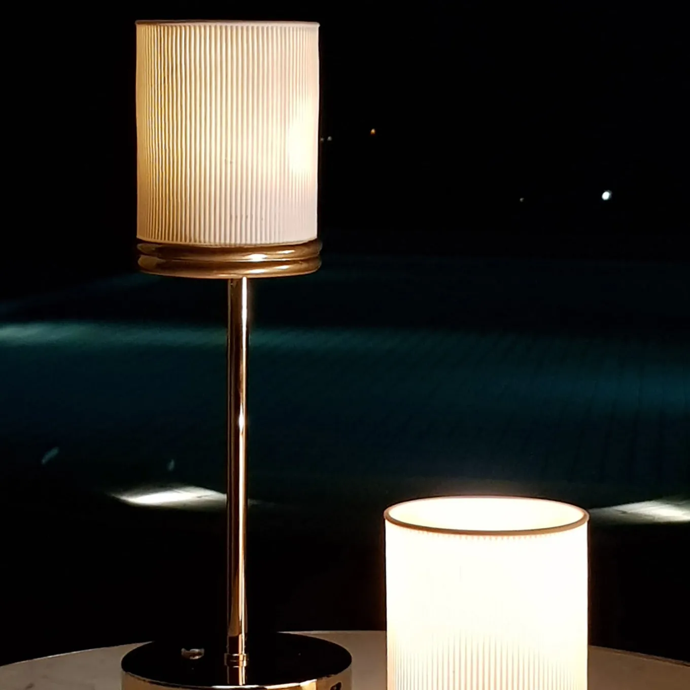 This stunning table lamp is a superb addition to an elegant interior, where it will provide a room of a sophistication object of functional decor that is extremely versatile, thanks to its wireless LED system. The structure is in brass with an antique gold finish functioning as support for the exquisite matte white porcelain shade embellished with a series of vertical ridges on the surface.