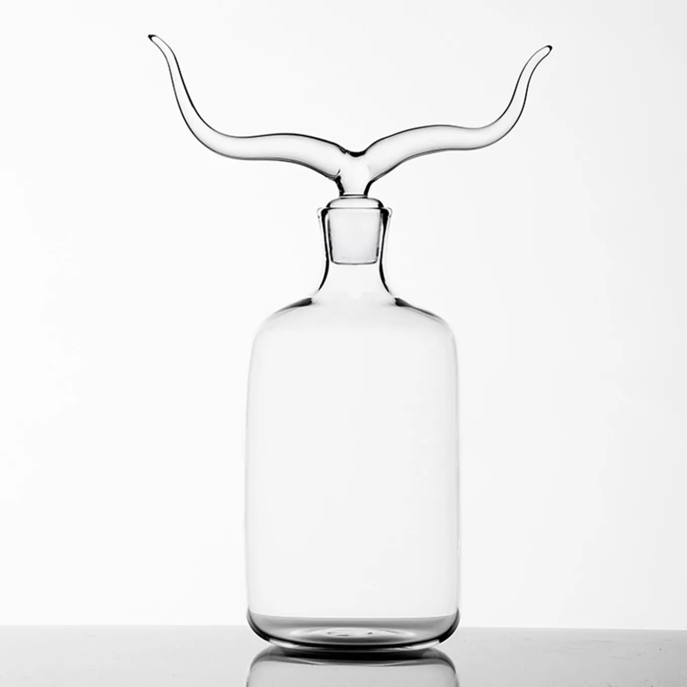 Part of the Trophy Bottles collection, one of the latest creations by Simone Crestani, this exquisite glass bottle features a stopper in the shape of an acorn. The stopper is decorated on top with a majestic set of buffalo antlers recreated in all their stunning details. Each trophy represents in detail the horns of a wild animal and dedicates a poetic hymn to the inhabitants of the most pristine nature.