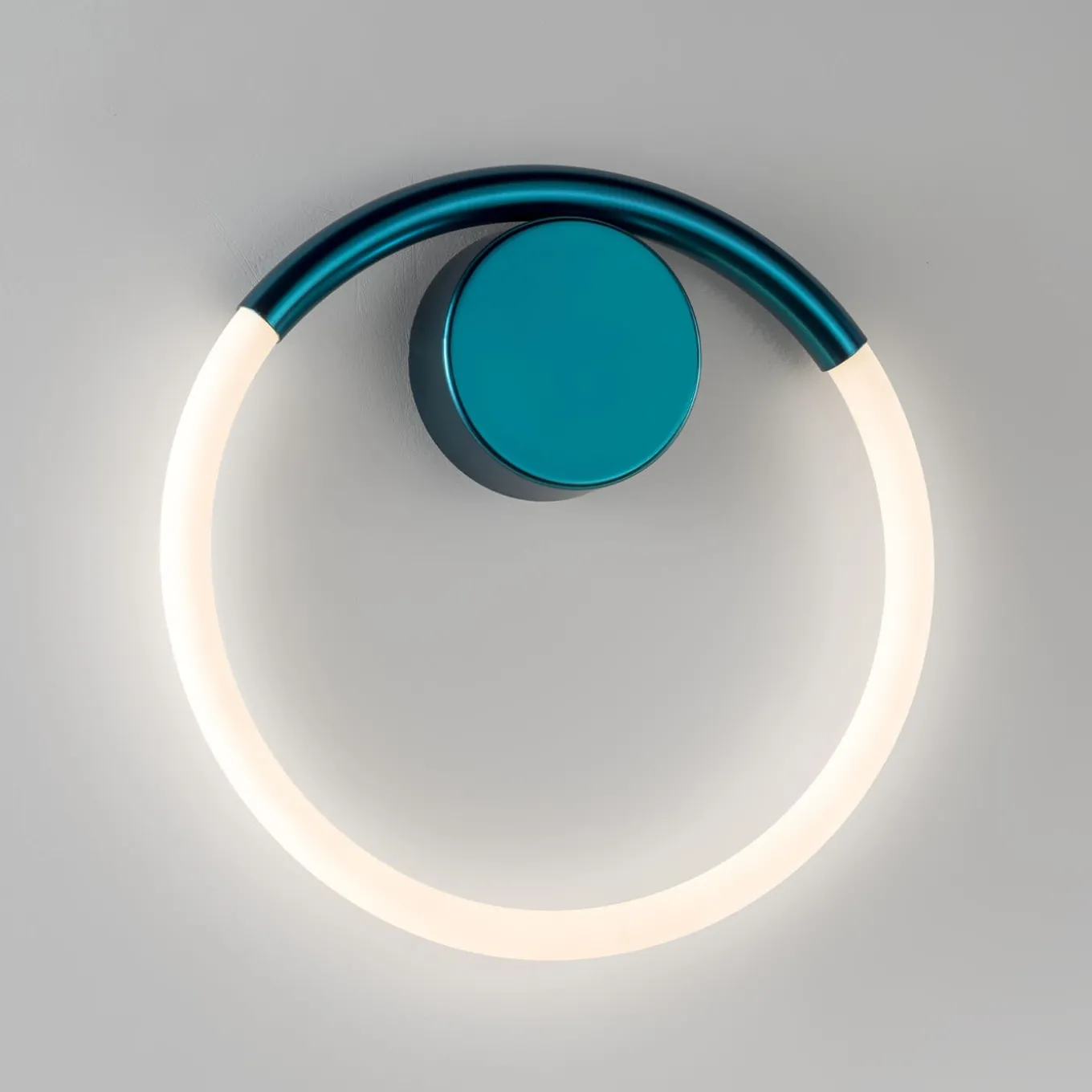 This wall-mounted lamp in blue matte metal features a striking circular LED ring that emits a soft, diffused glow. Its geometric form creates a sleek contrast against the wall, playing with depth and shadows. The carefully finished metal base ensures stability while enhancing its contemporary aesthetic. Part of the Loop collection, this lamp seamlessly blends elegance with functionality, providing both ambient lighting and an artistic visual statement.