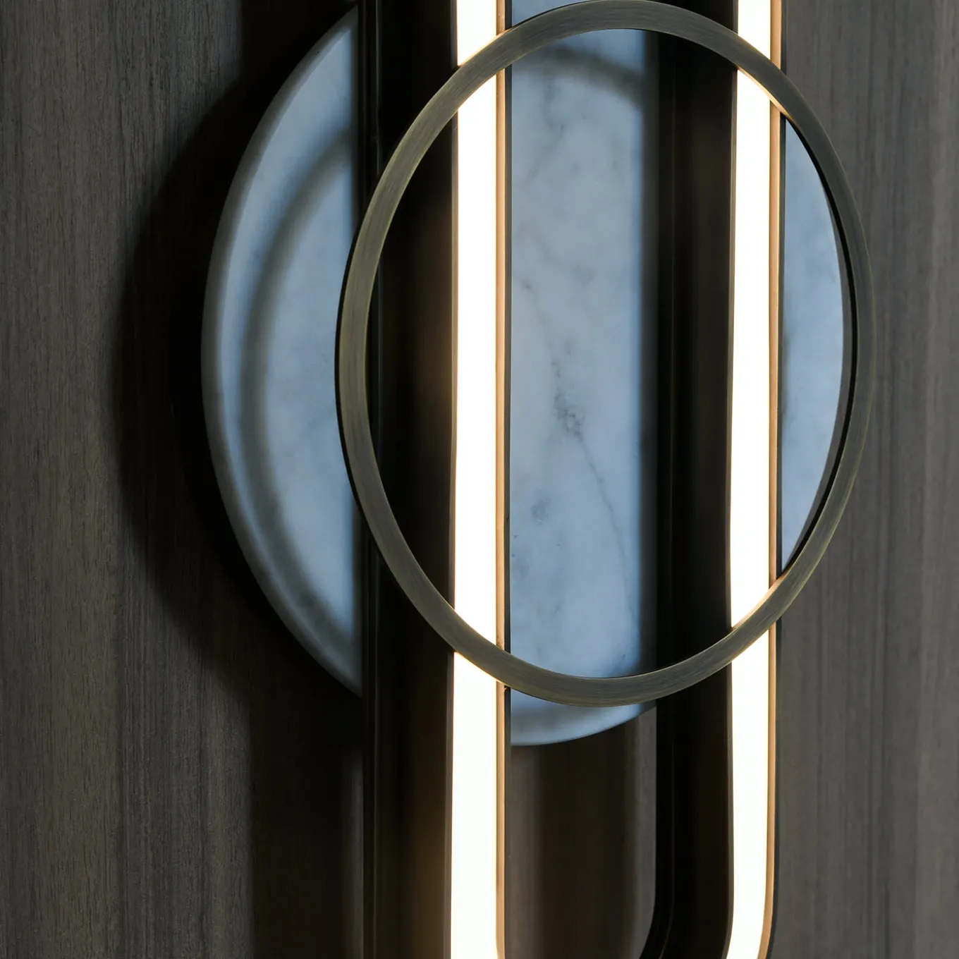 Imbuing a contemporary living area with clean and subtle refinement, this sconce is handmade of first-rate materials, combining simple geometric lines in a timeless and dynamic shape. Emitting a diffused light, it features a round marble rose and a galvanized and curved brass structure. Customizable in marble type and light intensity, please consult the Concierge for additional technical specifications.