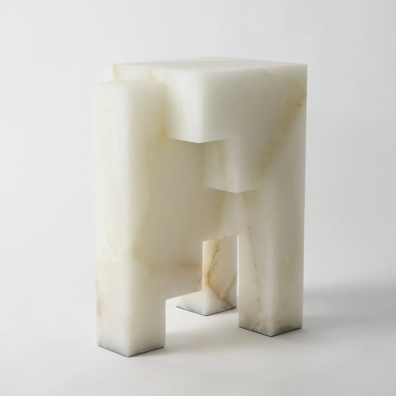 Crafted from stunning white onyx, the Los Tres Deseos Side Table serves a dual purpose as both a stool and a side table. This piece exemplifies meticulous craftsmanship and innovative design, drawing inspiration from contemporary aesthetics. Its sculptural form emphasizes a bold graphic presence, elevating any interior space with its strikingly elegant silhouette. Highlighted by the inherent beauty of the material, this side table is designed to showcase the unique characteristics of white onyx, ensuring each piece stands out in its own right. The design encapsulates a refined blend of functionality and artistry, making it an exceptional addition to a modern living environment.