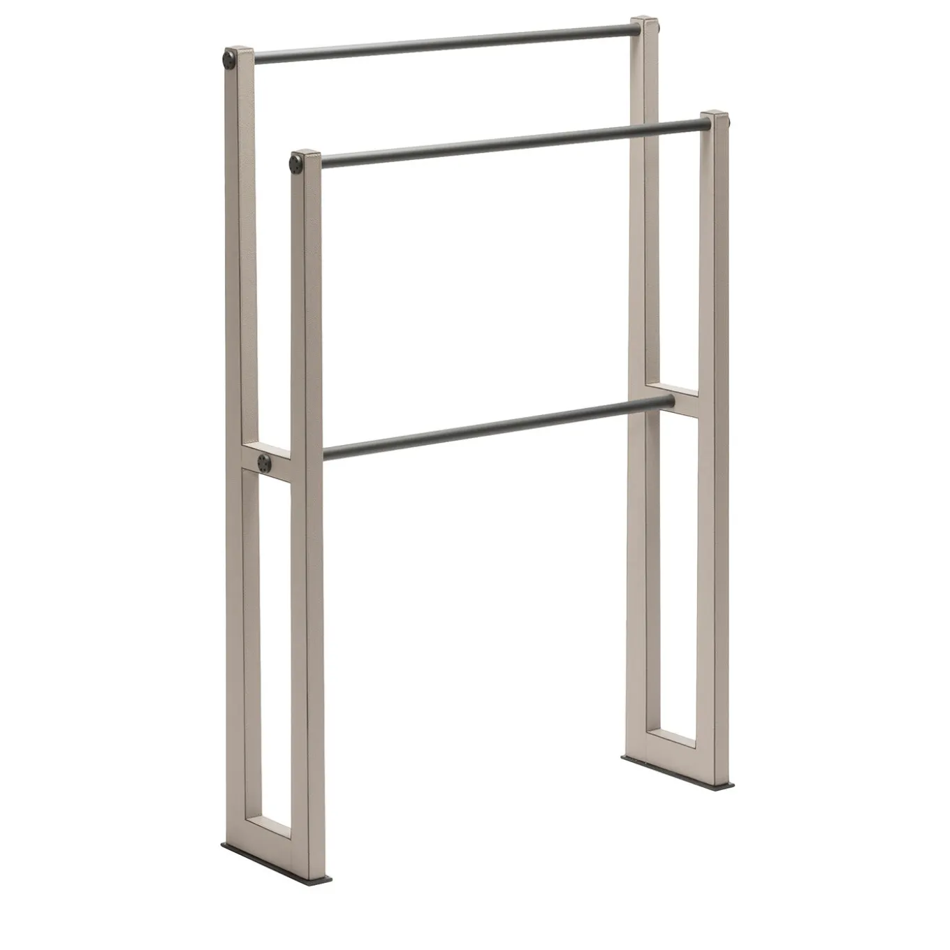 An elegant and refined addition to a minimalist or contemporary bathroom, this towel rack showcases a splendid combination of materials, sleek lines and hues. It features a wooden structure exquisitely upholstered in light gray-colored leather, enriched with three horizontal metal bars available in a chrome, bronze, or brass finish upon request. Other sizes are also available, please consult the Concierge for further details and customization options.