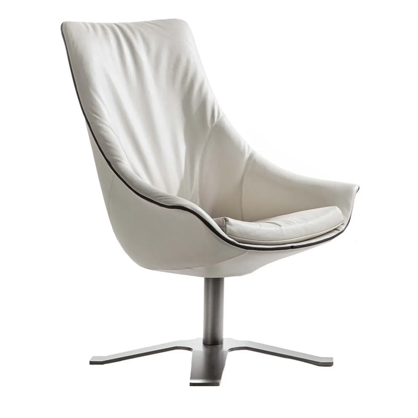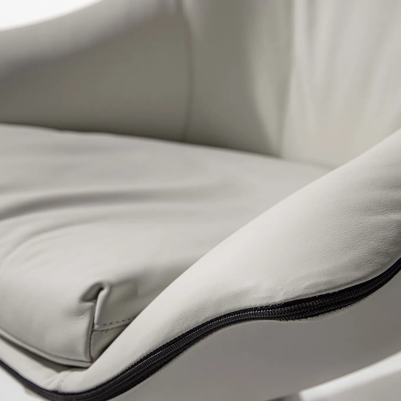Prioritizing comfort without compromising on comfort, this armchair is the epitome of modern elegance. Sporting an all-white look, the polyurethane shell with a tall back and slightly flared armrests is supported by a 4-star fixed base and upholstered inside with fine leather (built-in seat cushion included). Customization is available in several colors both for the base and upholstery (also in leather, eco-leather, and client’s fabric). Pouf not included but available for purchase separately, please inquire with the Concierge.