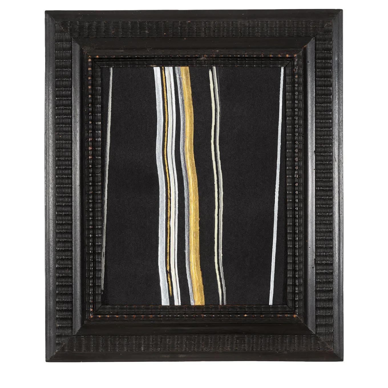 Stunning and timeless, this visionary subject was painted by Vittore Frattini in March 2020 on canvas (40 x 31cm frameless) with acrylic colors and Lumen, a blend of durable acrylic co-polymers that maintains the original colors for several years. Inspired by natural phenomena such as lightning and storms, this painting is enclosed in a bronze-hued rectangular frame recalling the luminous golden flair of the luminescent lines.
