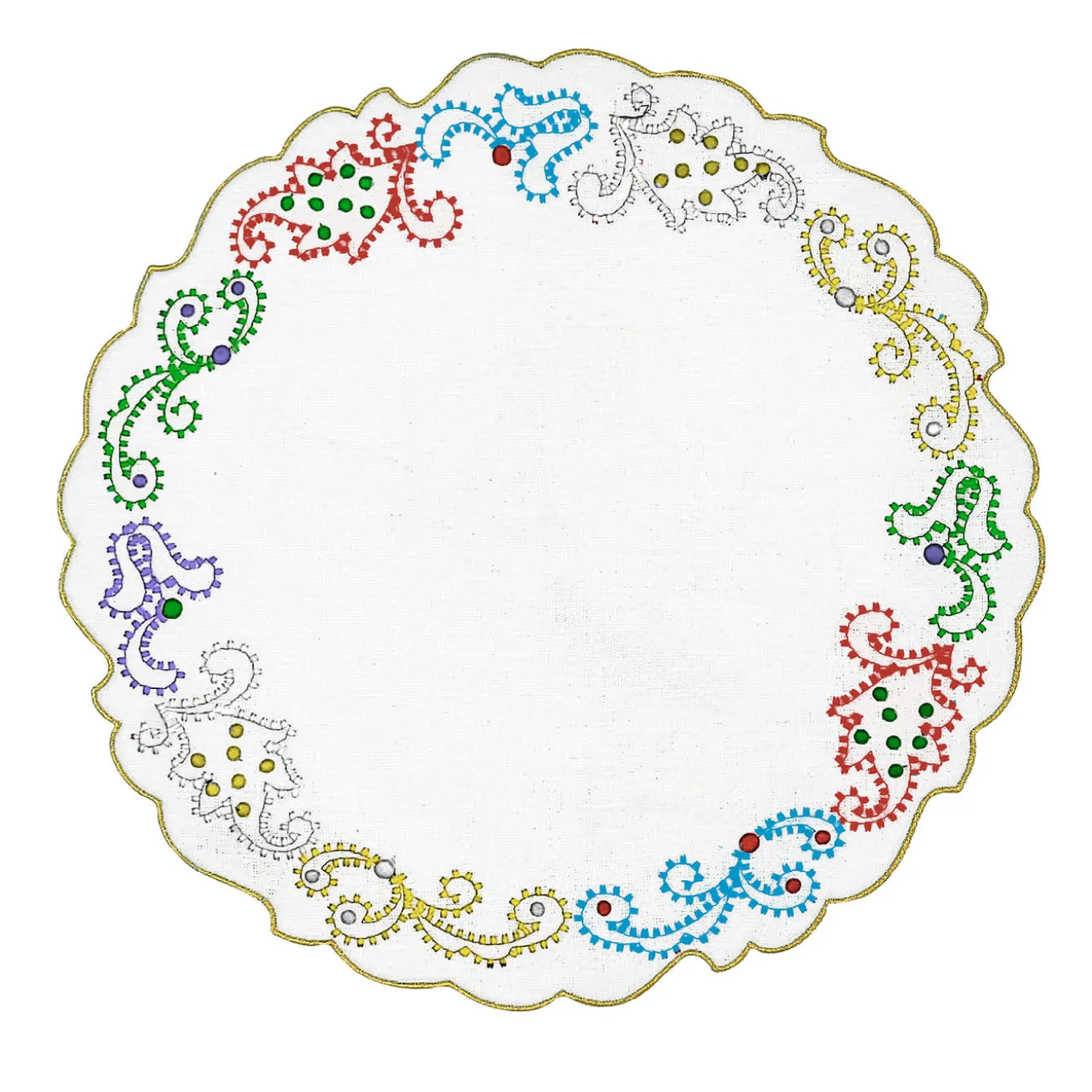 Evoking the spectacle of colorful light installations from Apulian town festivals, a crown of minute and vibrant manual embroideries lends this set of two linen charger placemats their playful allure. The lights’ dynamic profiles also inspired the placemats’ shaped borders, for a coherent and distinctive rhythm. Masters-of-linen-certified, the set only employs fine Mako cotton for its embroideries.
