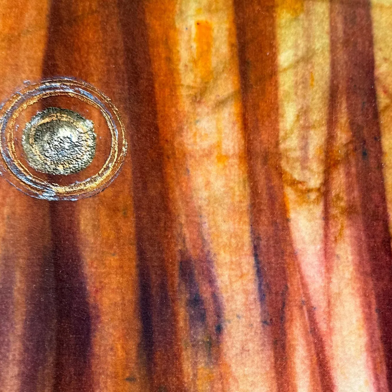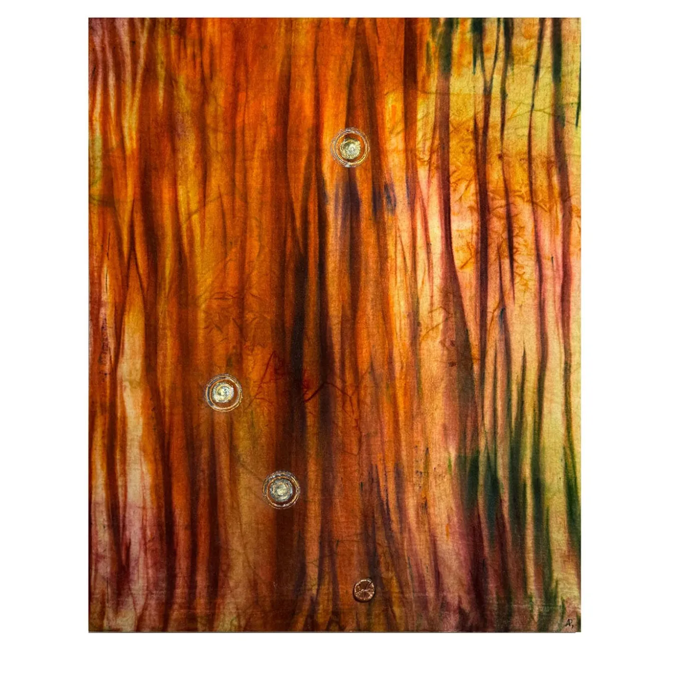 This tapestry features a unique hand-dyeing technique with natural pigments and colored pastes, creating rich, layered hues reminiscent of a forest glow. Accented with Murano aventurina glass details, it adds depth and strength to the composition. Mounted on a solid wooden frame, the soft velvet silk base enhances its elegant texture and presence, making it a refined addition to contemporary interiors.