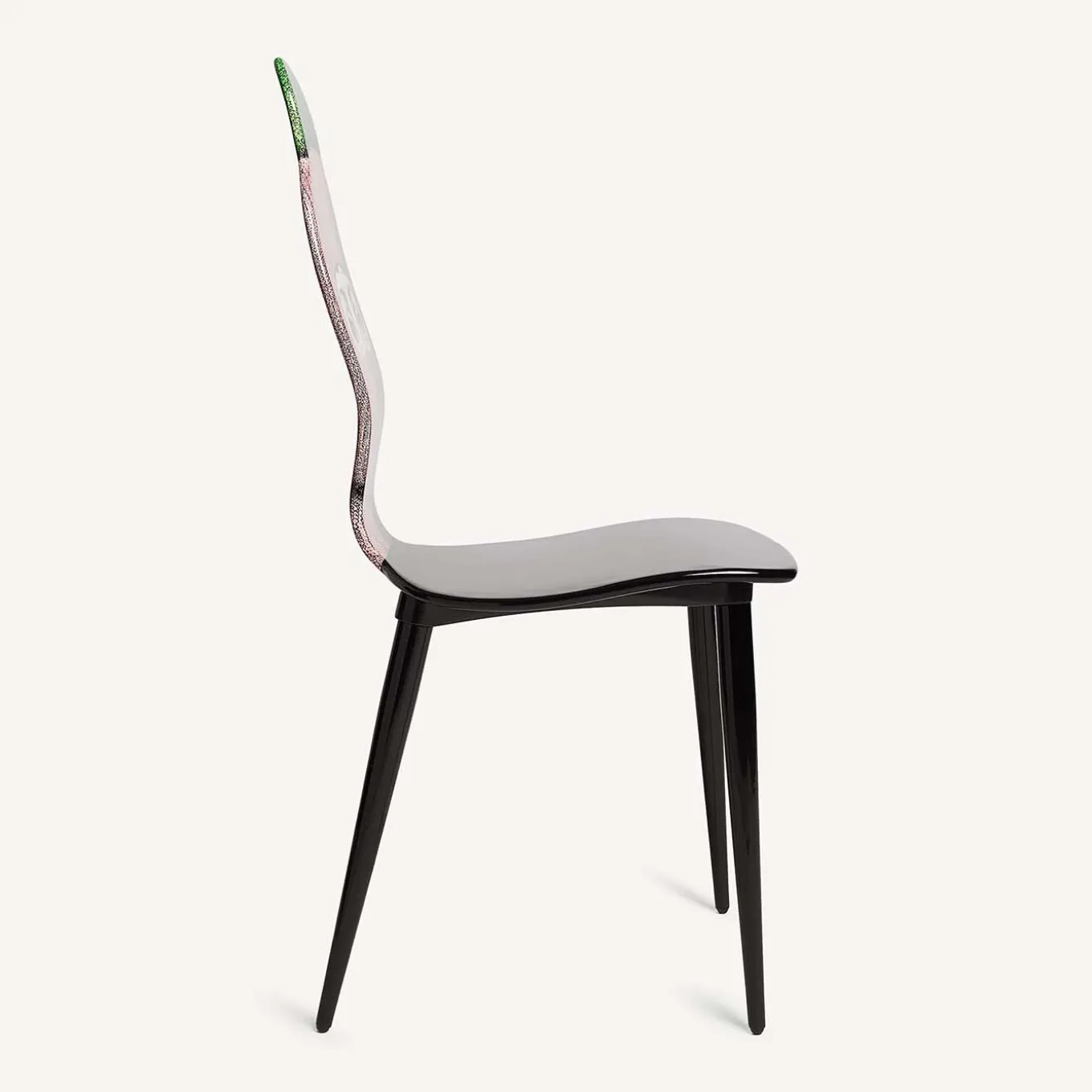 Hand-silkscreened, painted, lacquered and fitted with solid wood legs, this chair is the result of a collaboration with interior decorator Anne Lux for a chalet in Gstaad. The decoration belongs to the Tema e Variazioni series. Any minor discrepancies between similar creations are the result of craftsmanship and attest to the uniqueness of each product.