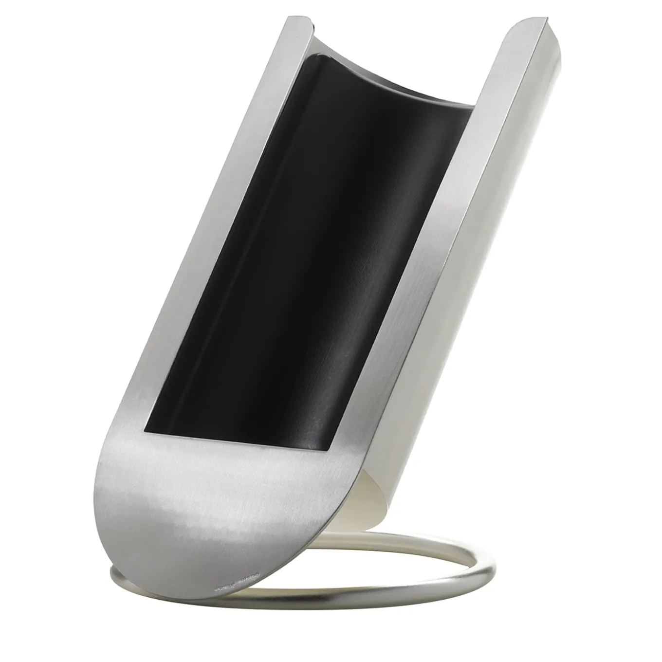 Clean and harmonious profiles trace the silhouette of this luxurious wine chiller, its brass alloy structure sealed by a gleaming satin silver plating. Sustained by a ring-shaped base, the slanted shell is equipped with a cold accumulator to be placed in the freezer before use to keep the bottle cool without the need for ice. Multiple versions are available in the Artemest catalog.