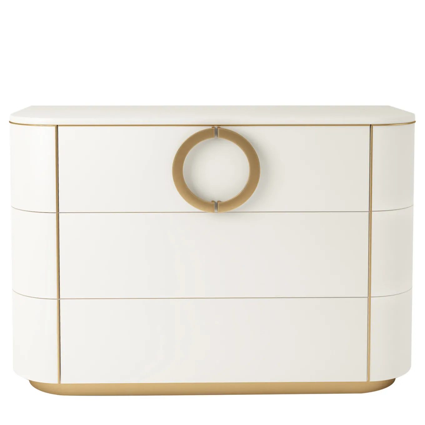 Designed by Isabella Costantini and realized by expert Italian artisans, the Maddalena dresser features three spacious drawers and sinuous lines which are elegantly enriched with metal handles and profiles. The plinth base is a sophisticated addition that elevates the piece, which will store your daytime essentials with style. Accessories and details: three eco-friendly leather lined drawers. Finish: ivory matt lacquered and metal details in brass finish.