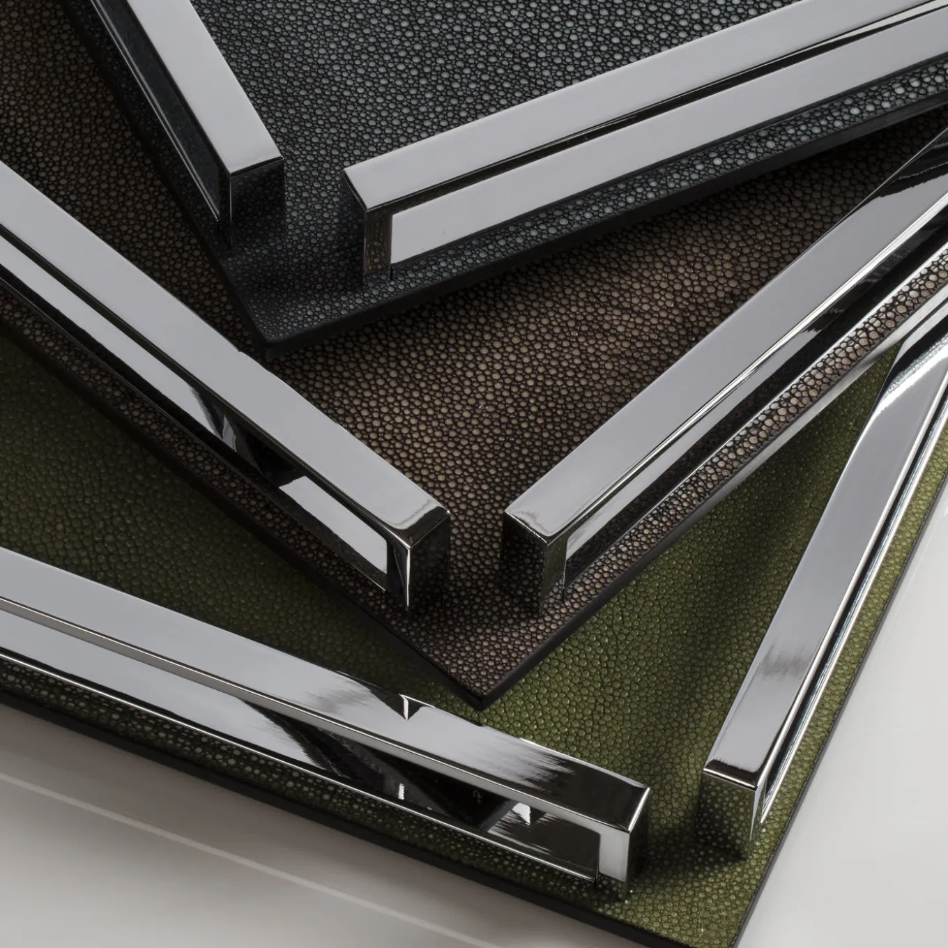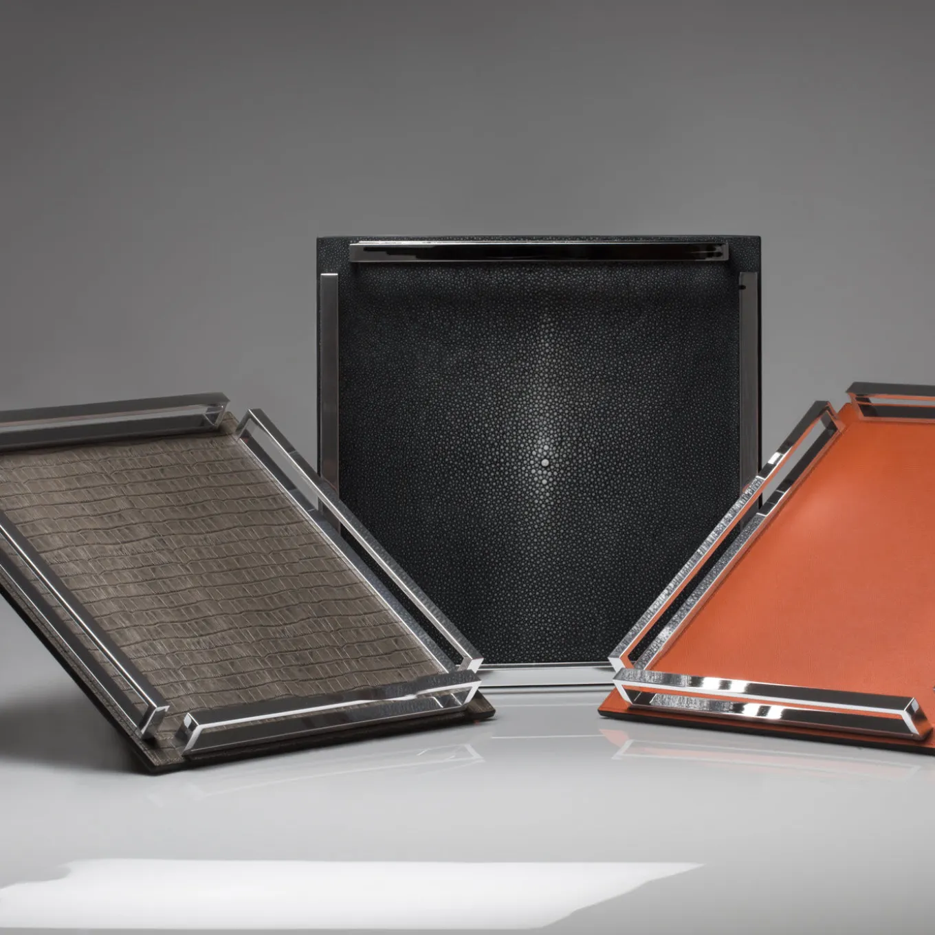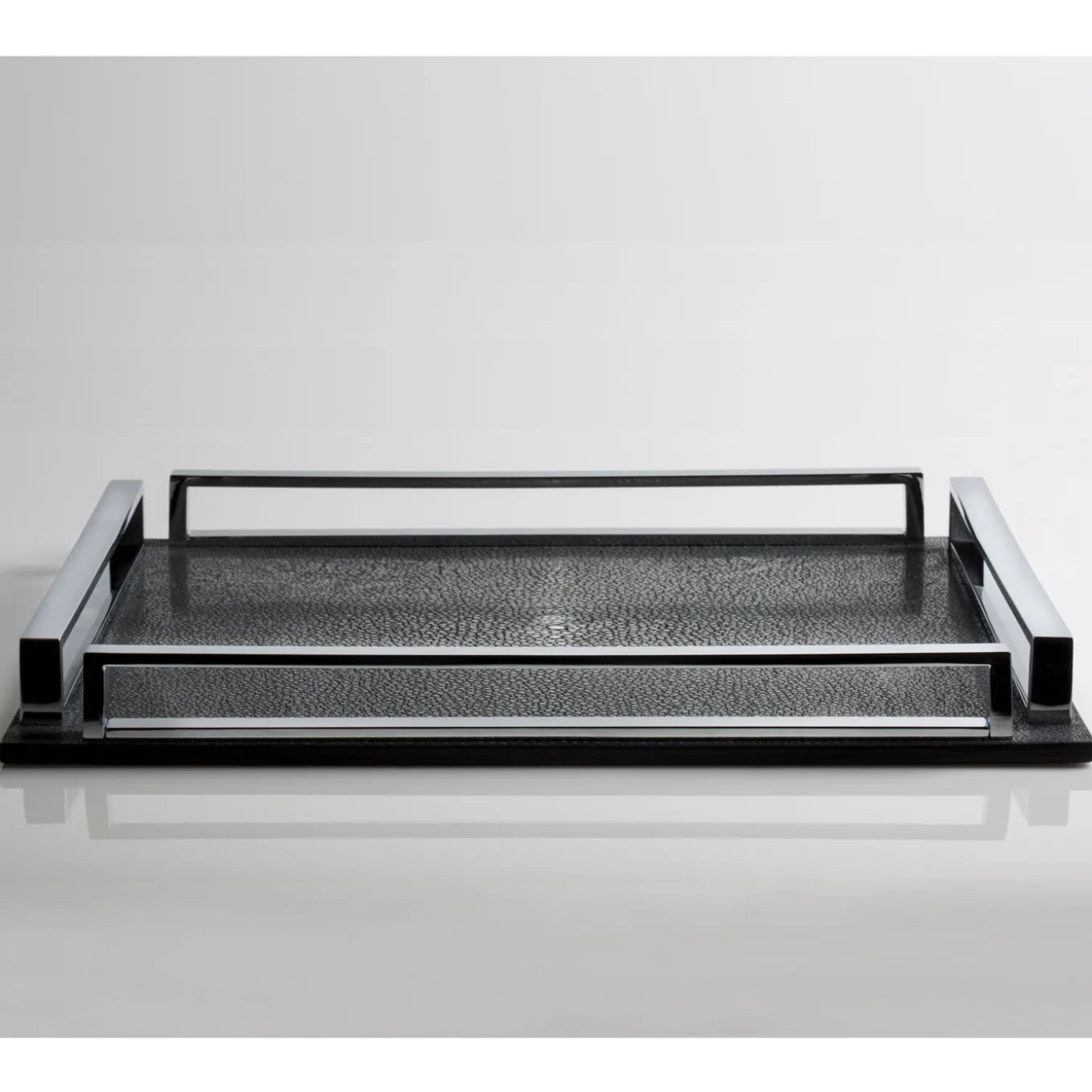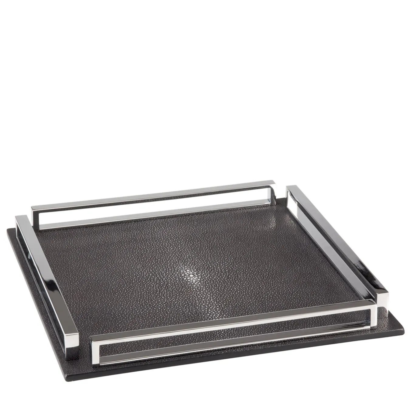 This superb tray will make a statement in any room. It can be used to style a modern entryway, or to serve small food in a living room. Its wooden base is upholstered in real shagreen leather dyed either in mole brown, whose unique and luxurious texture strikingly contrasts with the four geometric handles in chrome-finished metal. Exquisite craftsmanship and the use of fine materials make this piece a sophisticated addition to any decor.