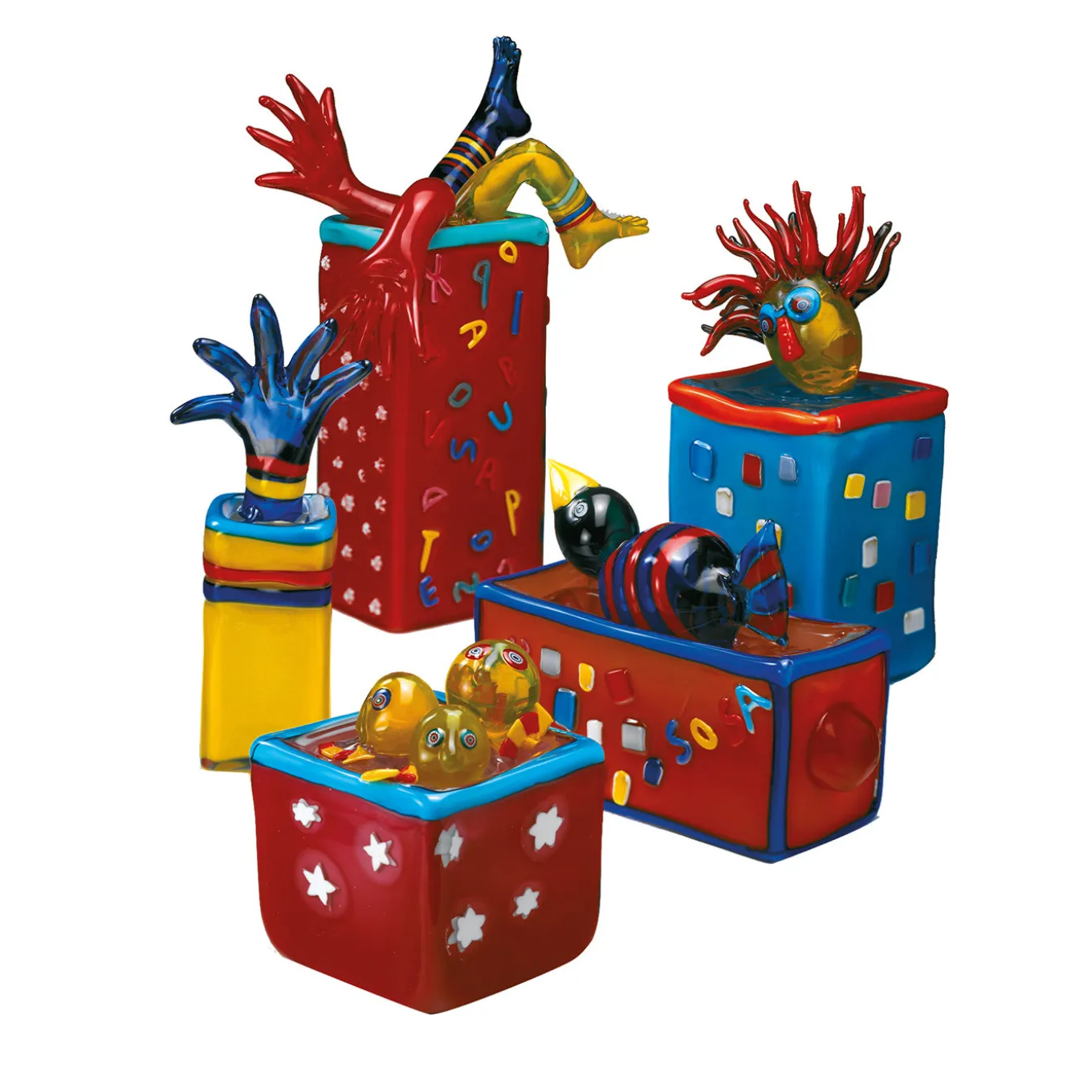 A majestic composition of five different sculptures in a single artwork, this piece was designed by Cuban artist Alfredo Sosabravo for a Limited Edition of 12 pieces handcrafted of solid glass by Ars Murano’s master glassmaker Toso Cristiano. Named after the Italian words for “Magic Storehouse”, it is composed of five different boxes of different measures from which emerge body parts and birds in an eclectic ensemble of colors and lines. This sculpture is signed by the artist.