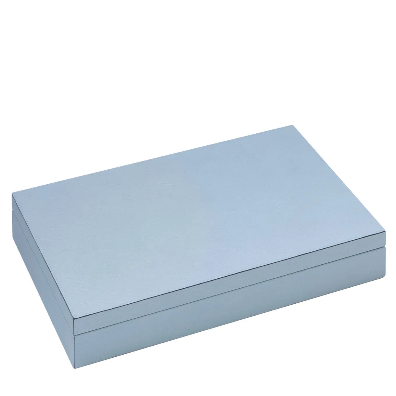 An ideal after-dinner game during family night or the perfect gift for board game lovers, this Mahjong game comes in a luxurious wooden box with a removable lid entirely covered with light blue leather. The set includes one set of Bakelite tiles and sticks, three standard-size and one large dice and a leather-covered dice with labeled sides (north, south, east, and west) to determine both the seating arrangement and the first player to begin the game.