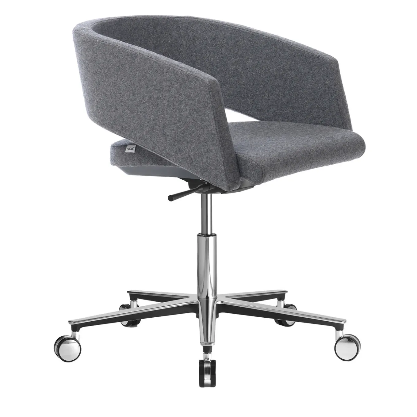 The perfect complement to a contemporary writing desk in a home study or office, this swivel chair combines style and functionality in an ergonomic silhouette. Resting on an adjustable chromed metal structure with castors, it features a captivating seat upholstered with gray fabric and enriched with an embracing, open backrest.