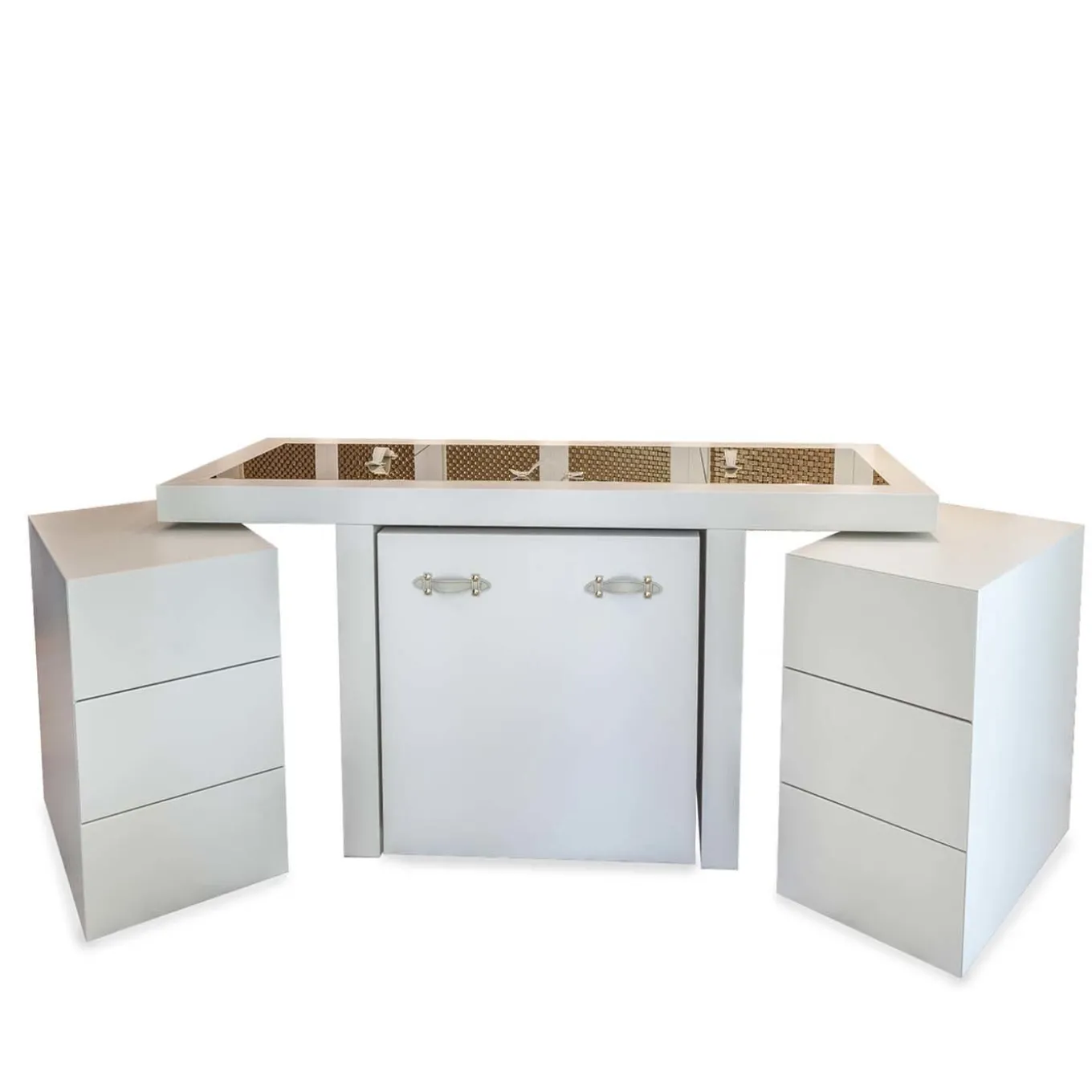 This unique vanity desk is composed of three pieces: a central T-shaped desk and two sleek lateral units with drawers set on wheels that can be moved close to the central piece for a compact look. The desk, that merges minimalist lines with retro-vintage details, has a wooden structure with a matte lacquered white finish and a pull-out seat with padded cushion covered in elegant fabric. The top has three flip-top doors with 24k gold finish that conceal a series of oak compartments and a large mirror on the central panel.